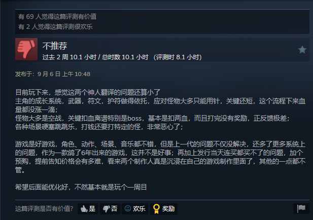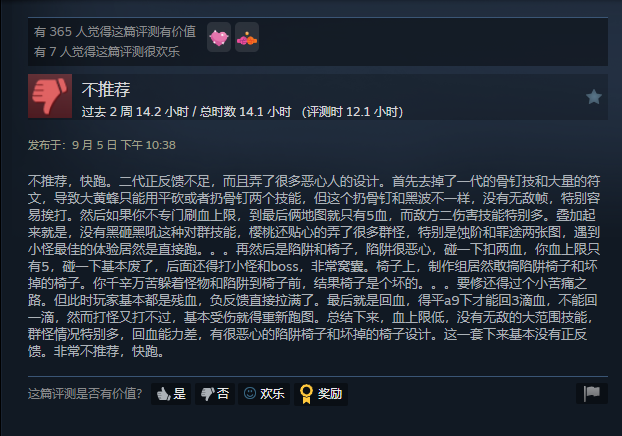 【《空洞骑士:丝之歌》Steam简中好评率跌至46%】类银河战士恶魔城游戏《空洞骑士:丝之歌》于9月4日正式发售后引发全球热潮。不过本作在简中区好评率已降至46%(褒贬不一),而全球总好评率保持86%。除了之前提到的大部分为简体中文本地化翻译的相关差评外,其他一些差评主要集中在本作的操作手感、游戏难度、资源分布和奖励机制安排等问题上。