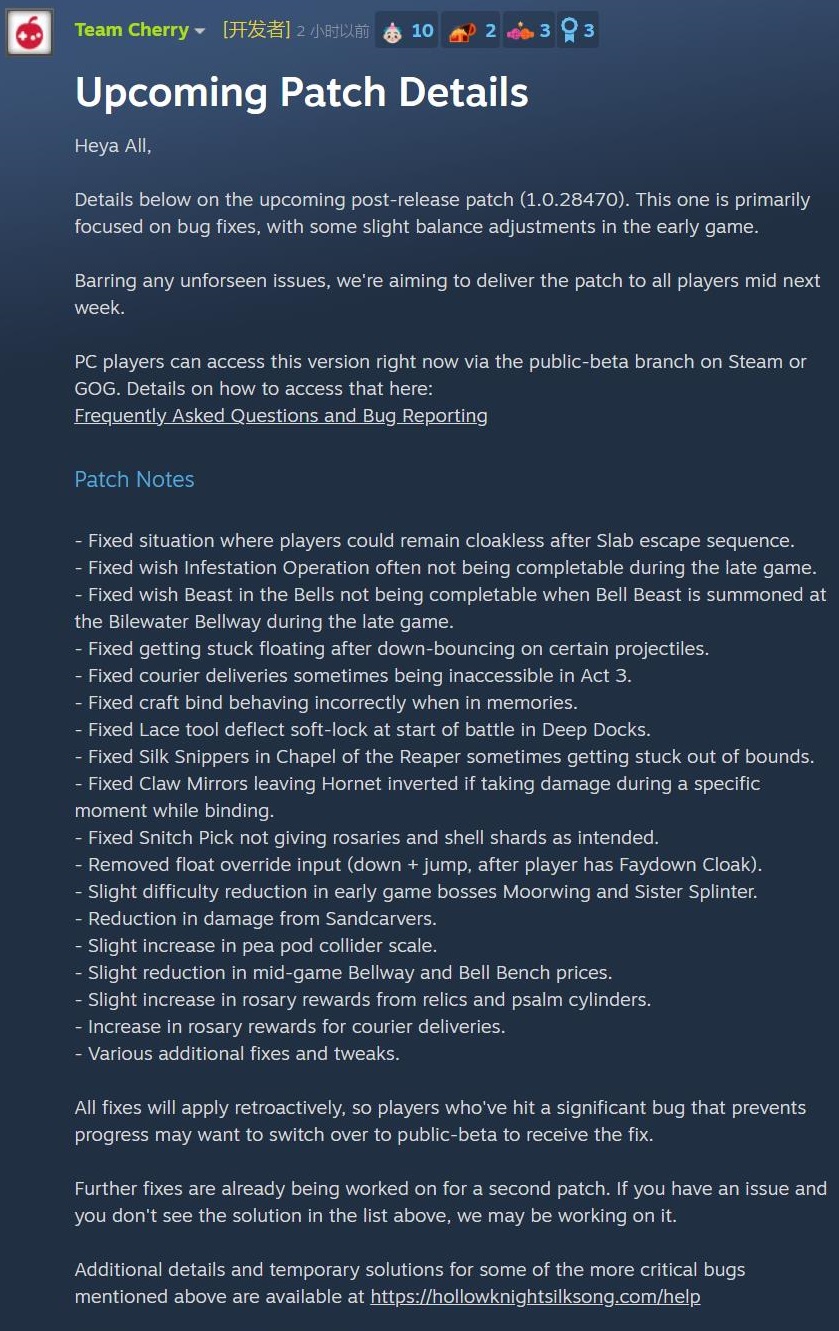 【《丝之歌》更新补丁下周上线,将下调游戏难度】开发商Team Cherry宣布《空洞骑士:丝之歌》首个更新补丁(1.0.28470)将于下周上线。目前PC版玩家可以通过Steam或GOG的公测分支抢先体验该版本。此次更新将主要修复游戏中的已知BUG以及游戏早期的平衡性调整,包括部分BOSS的伤害下调和念珠奖励提升等。官方同时表示,第二个补丁也正在开发中,预计会解决更多已知问题。
