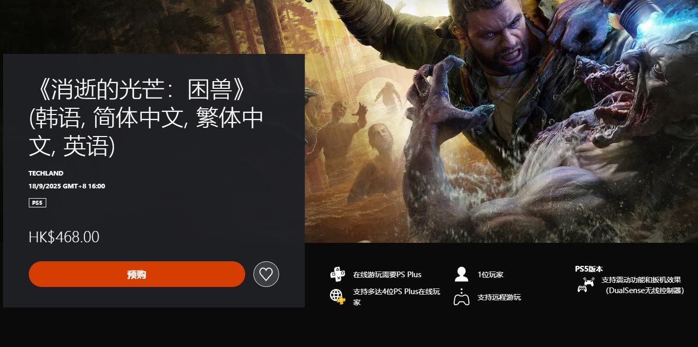 【《消逝的光芒:困兽》PS5版大小约36.5GB】根据PlayStation Game Size所提供的数据显示,《消逝的光芒:困兽》PS5版大小为36.546 GB(版本01.001.000)。游戏标准版售价468HKD,今日开启预约,预计9月19日北京时间零点解锁(全平台同步发售)。本作中,玩家将扮演被改造成半人半兽的凯尔•克兰在美丽又危险的河狸谷展开冒险。除PS5外,游戏也会在Steam、Epic、Xbox Series上推出。
