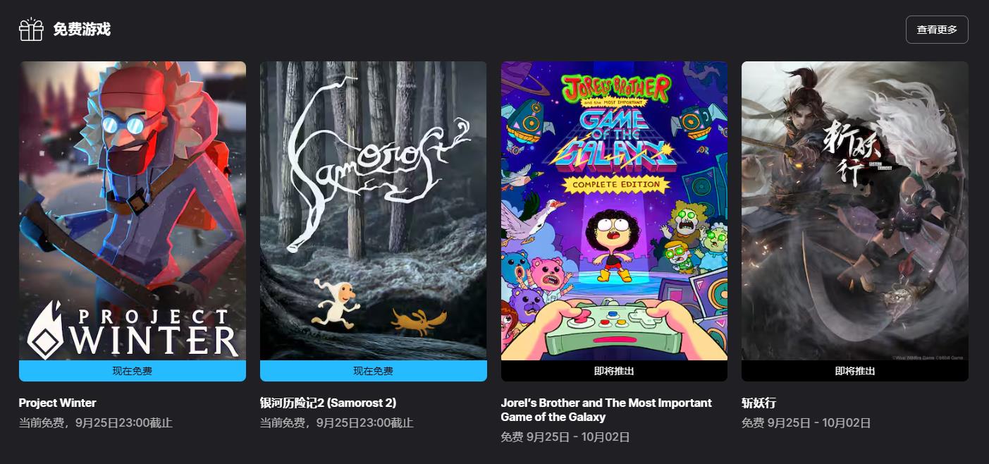 【Epic喜+2】多人社交对抗游戏《冬日计划》和冒险游戏《银河历险记2》现已可在Epic商店中免费领取,领取后永久入库,截止时间到9月25日23:00。下周免费游戏为《乔雷尔的兄弟和银河系最重要的游戏(Jorel’s Brother and The Most Important Game of the Galaxy)》和《斩妖行》。