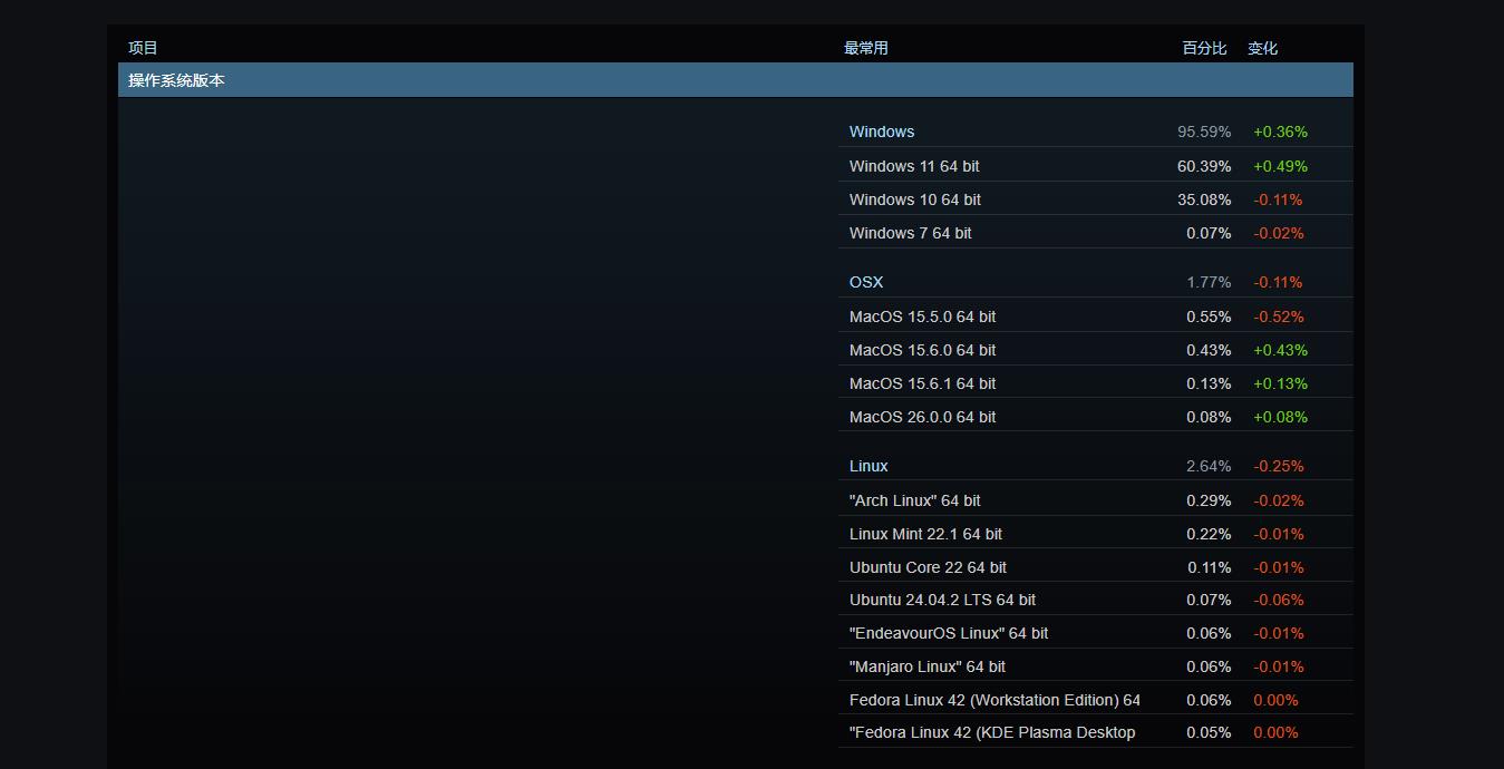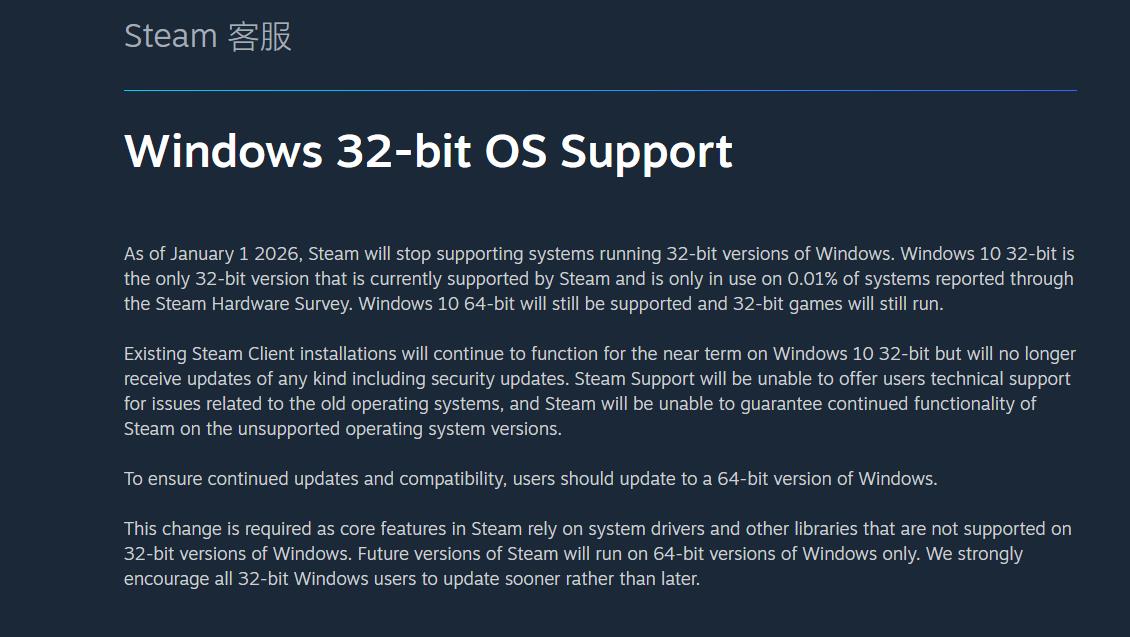 【Steam将于明年1月起停止对32位Windows系统的支持】根据V社官方信息显示,Steam将于明年1月1日起将停止对Windows 32位系统的支持。目前32位Windows 10是Steam唯一支持的32位版本,据悉用户占比仅有0.01%。根据8月版的Steam硬件调查,目前Windows是玩家们所使用的主要系统,使用占比为95.59%。其中64位Windows 11占比为60.39%,其次是64位Windows 10,占比35.08%。
