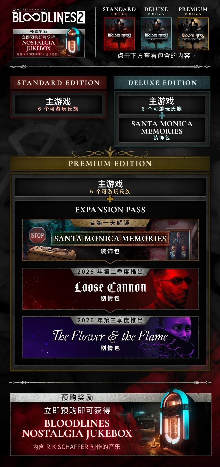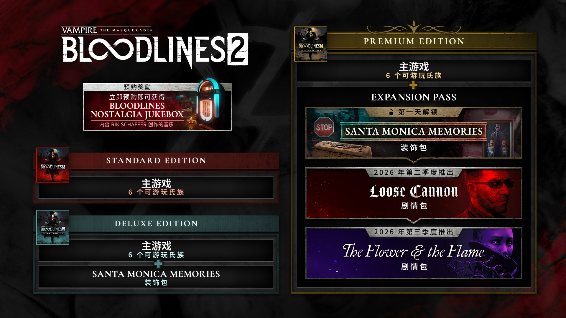 《吸血鬼:避世血族2》:首日版(59.99美元/49.99英镑/59.99欧元):包含基础游戏和“血脉怀旧点唱机”(Bloodlines Nostalgia Jukebox)预购奖励。部分零售商还将提供一条受圣詹姆斯十字架启发的实体项链。 《吸血鬼:避世血族2》:高级版(建议零售价89.99美元/74.99英镑/89.99欧元):包含基础游戏、“血脉怀旧点唱机”预购奖励、扩展通行证、五张角色卡、一本日志和一个铁盒,全部包装在一个高级盒子中。