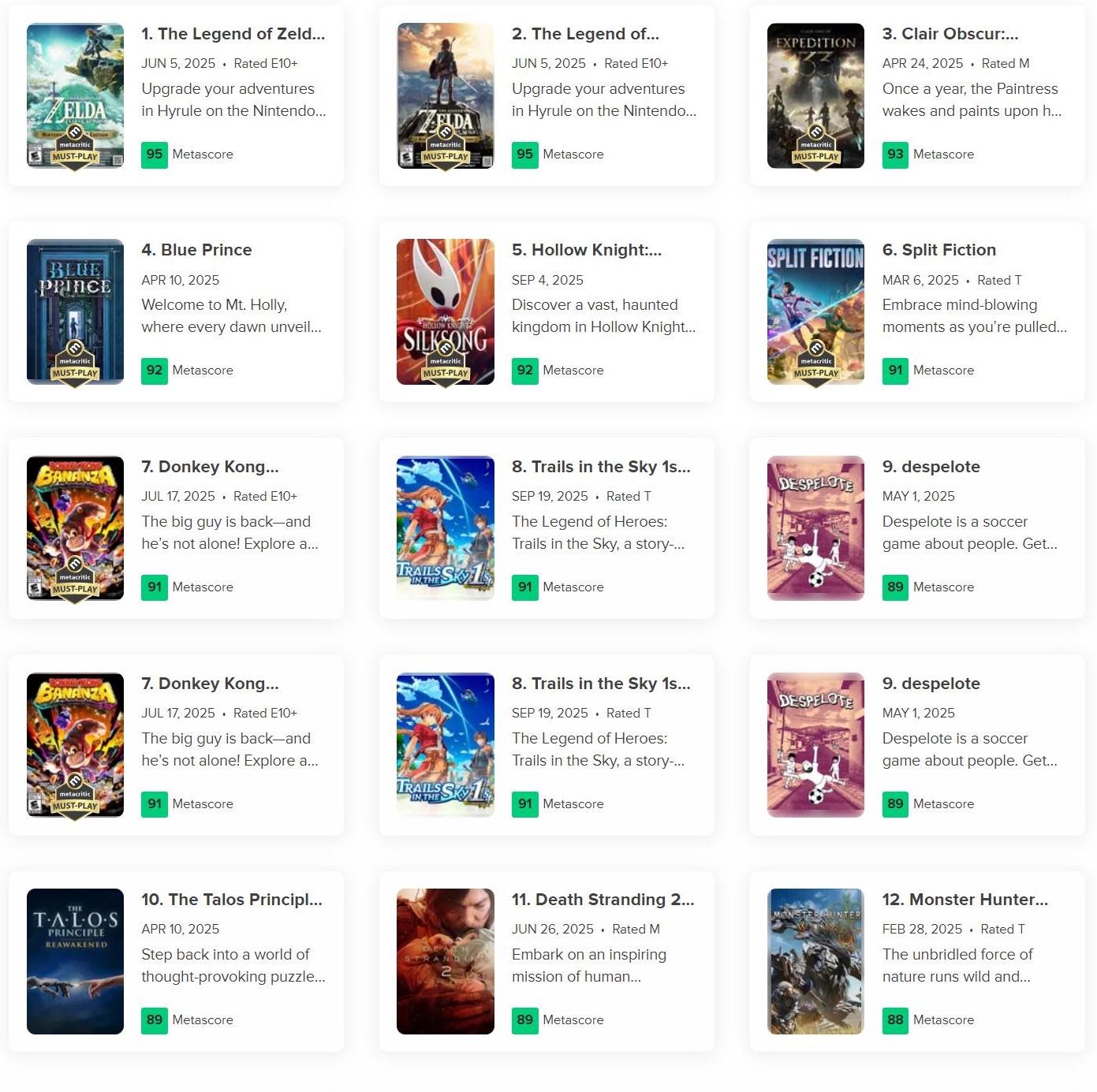 【2025年MC高分游戏榜更新:《丝之歌》《空之轨迹》跻身前十】随着本月《空洞骑士:丝之歌》《空之轨迹:the 1st》的发布,今年MC的高分游戏榜单的前几位排名也发生了一些变化。目前TOP 10名单如下: