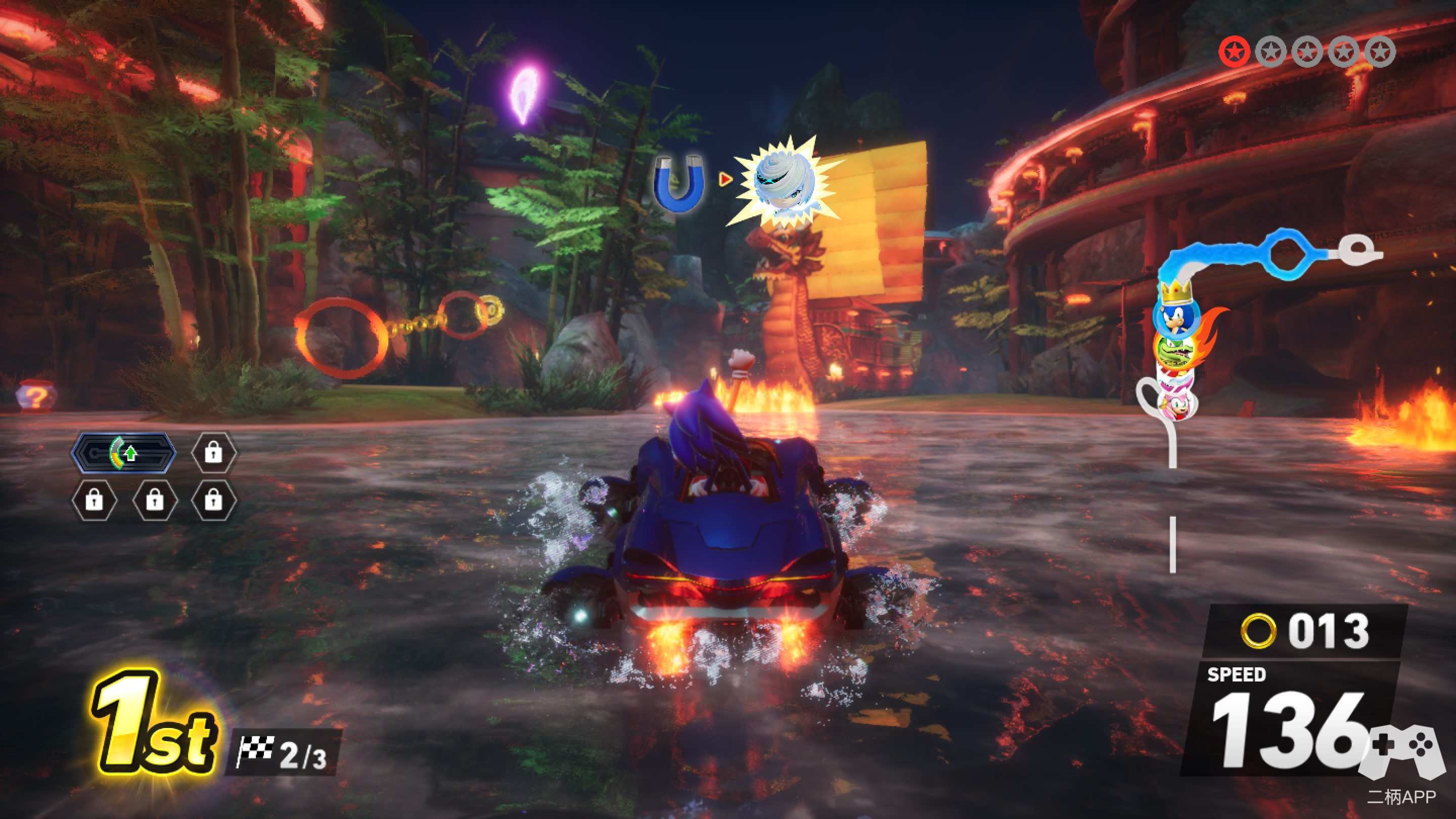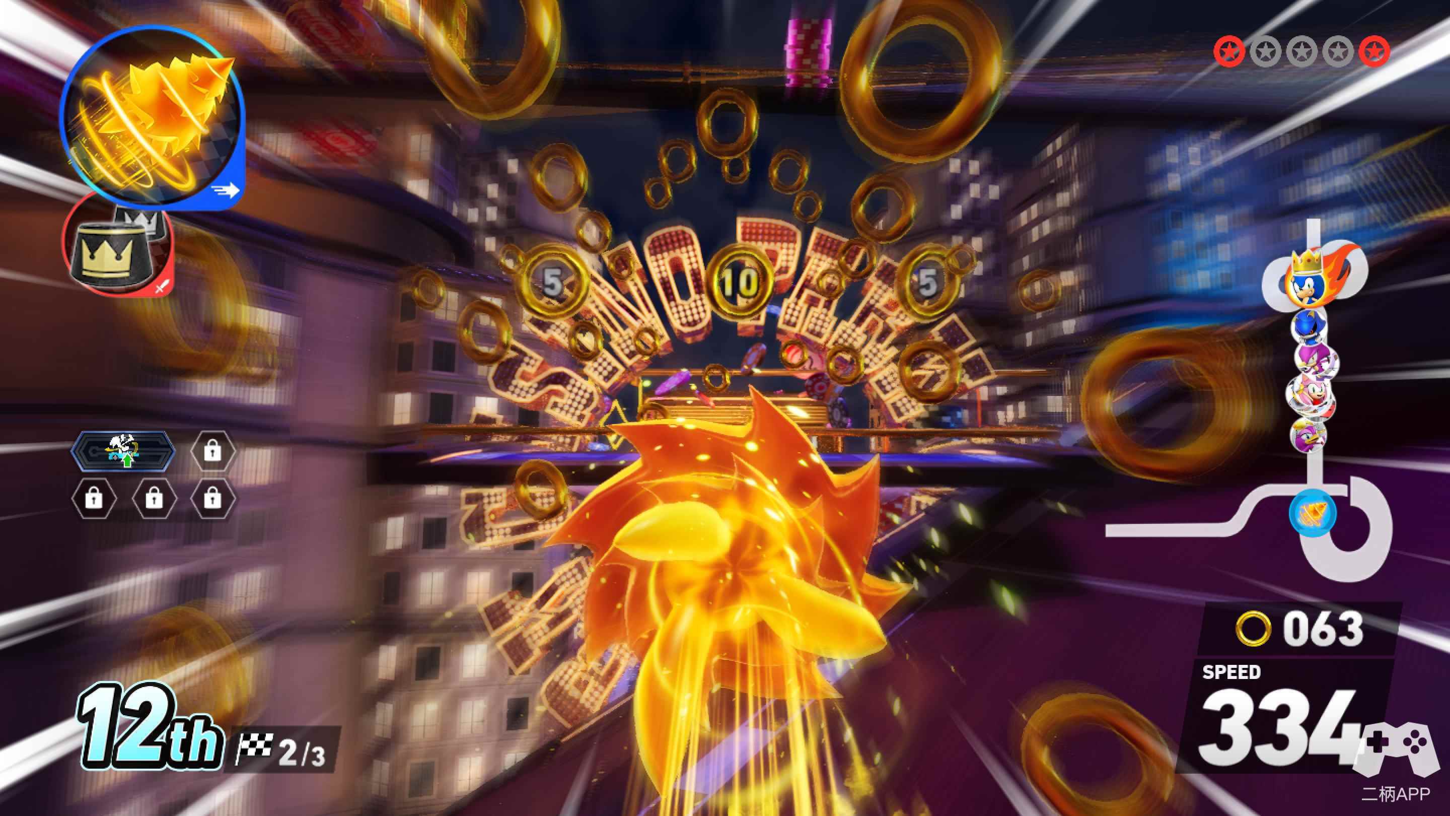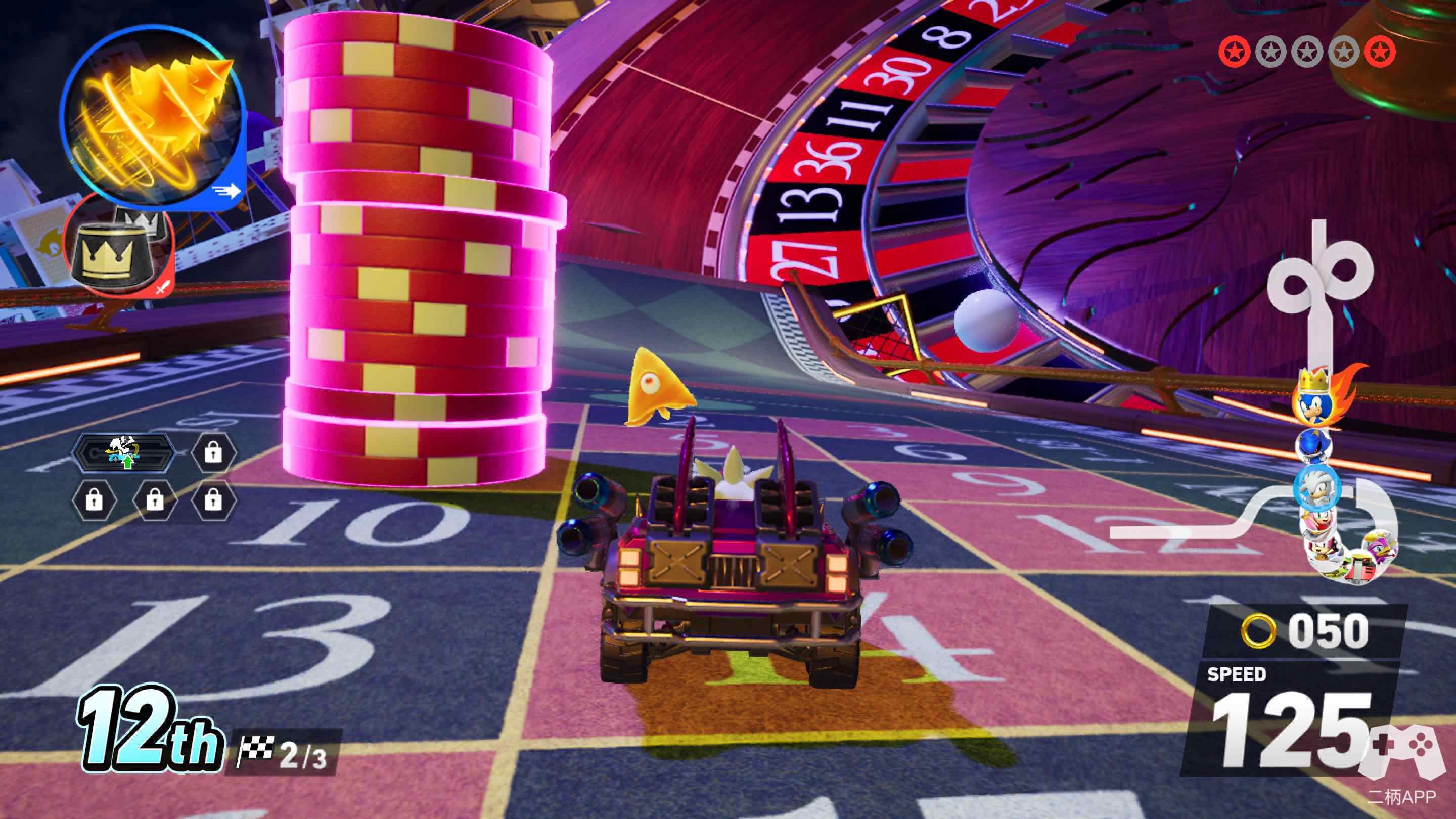 除了尤为惊艳的随机传送门,本作的赛道上还布满了各式道具和索尼克系列经典的“金环”,通过拾取金环,玩家的车辆可以获得最大速度,但是在发生碰撞或者被减速道具击中时会丢失部分金环。