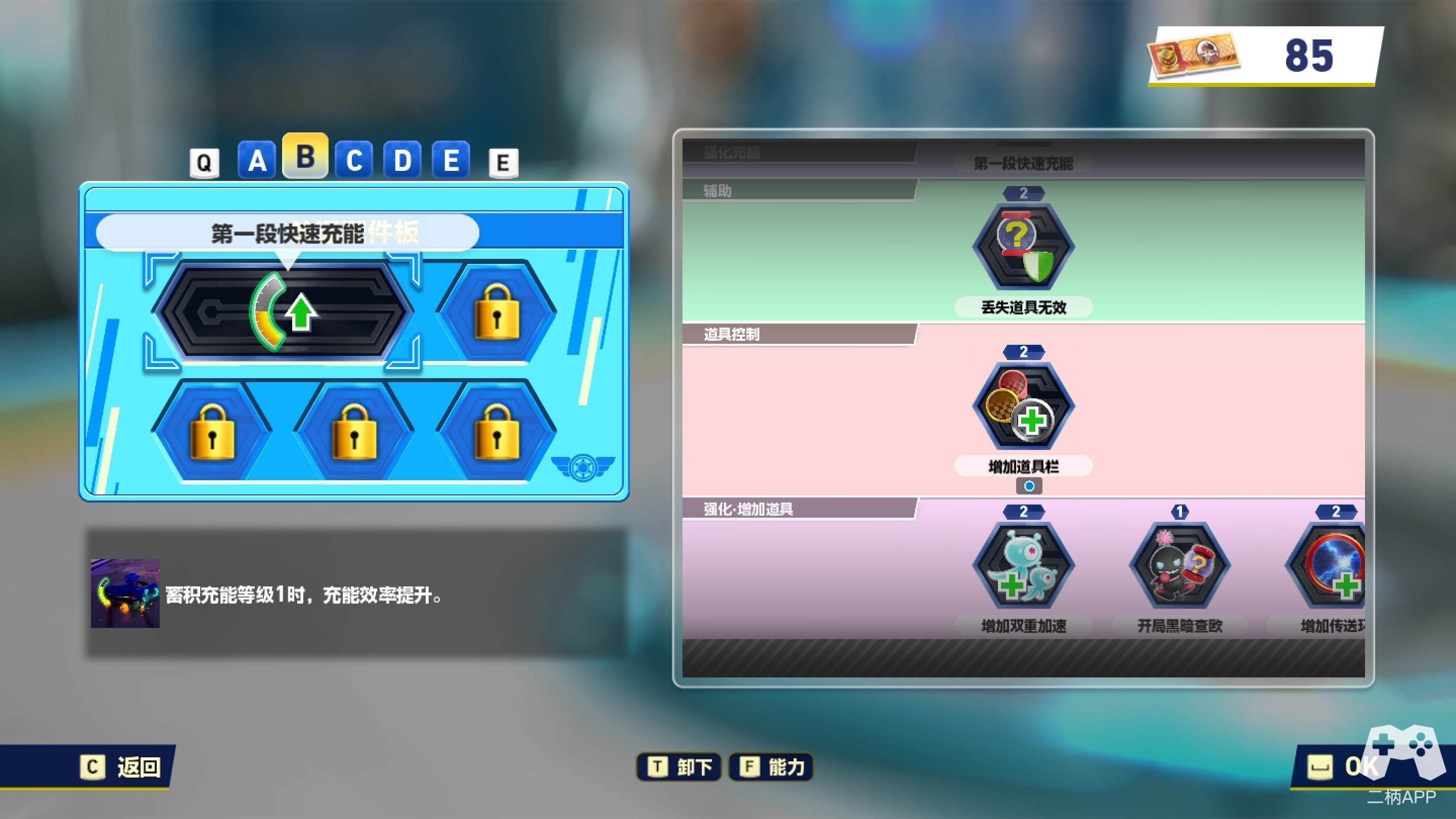 接下来就是本作较为核心的配件板系统,随着比赛场数的积累,玩家可以逐渐解锁最多六个配件板槽位。