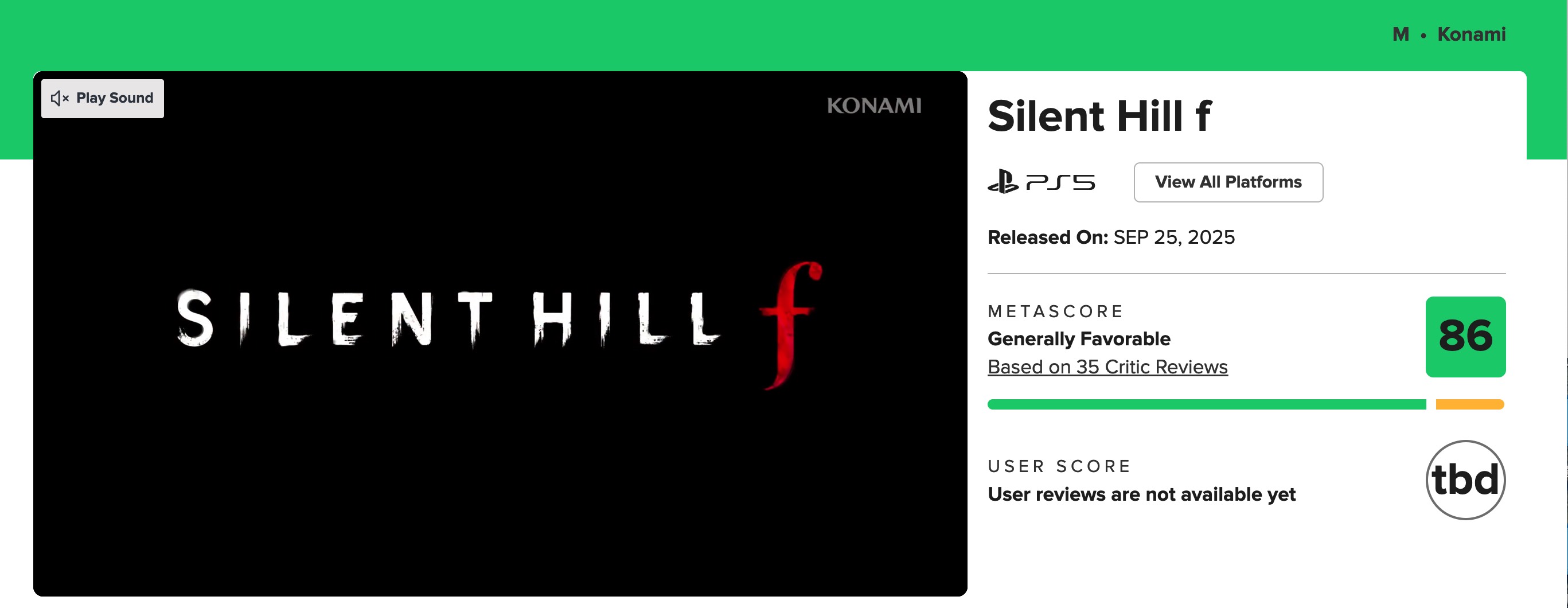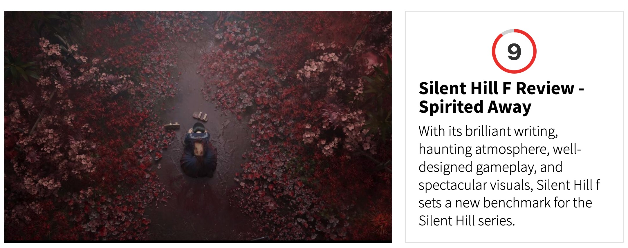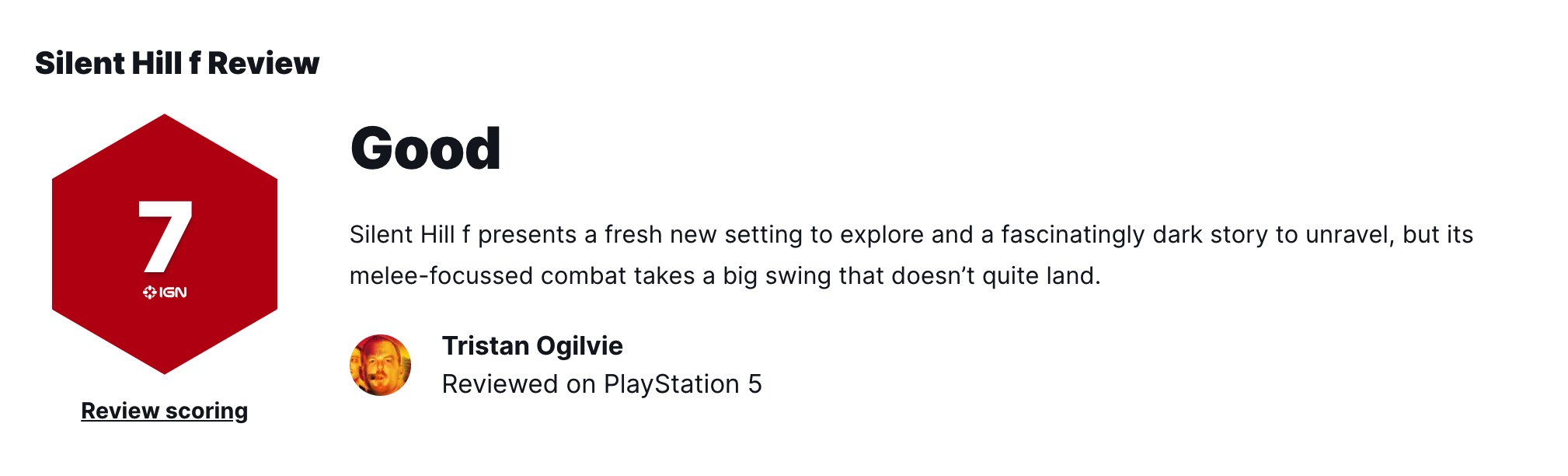 【《寂静岭f》MC媒体均分86,IGN7分、GS 9分评价】《寂静岭f》媒体评分已解禁,目前游戏在MC上PS5均分86(目前54家媒体)PC均分88(目前18家媒体),以下为部分媒体评分: IGN 7 GameSpot 9 Eurogamer 8 GAMINGbible 9 Push Square 7 GamesRadar+ 8