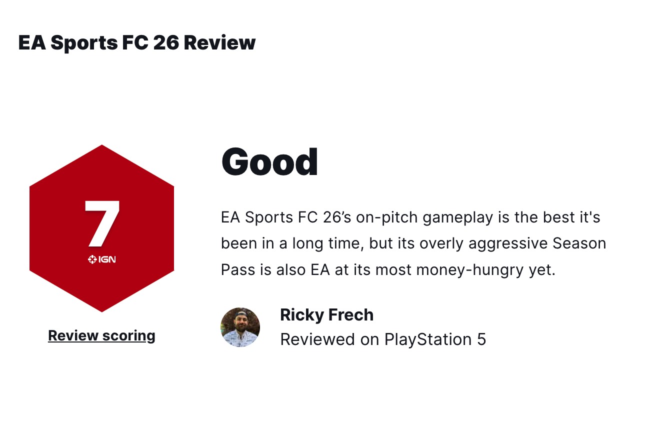 【IGN为《EA SPORTS FC 26》打出7分评价】IGN基于PS5平台为《EA SPORTS FC 26》打出7分评价。该媒体认为《EA Sports FC 26》在操控手感和比赛体验上有明显提升,控球、传球和门将表现都更出色,但游戏对盈利模式的依赖加重,微交易和赛季通行证干扰了体验。尽管如此,游戏本身仍值得肯定,但也显示出EA对盈利的高度关注,引发玩家对未来的担忧。