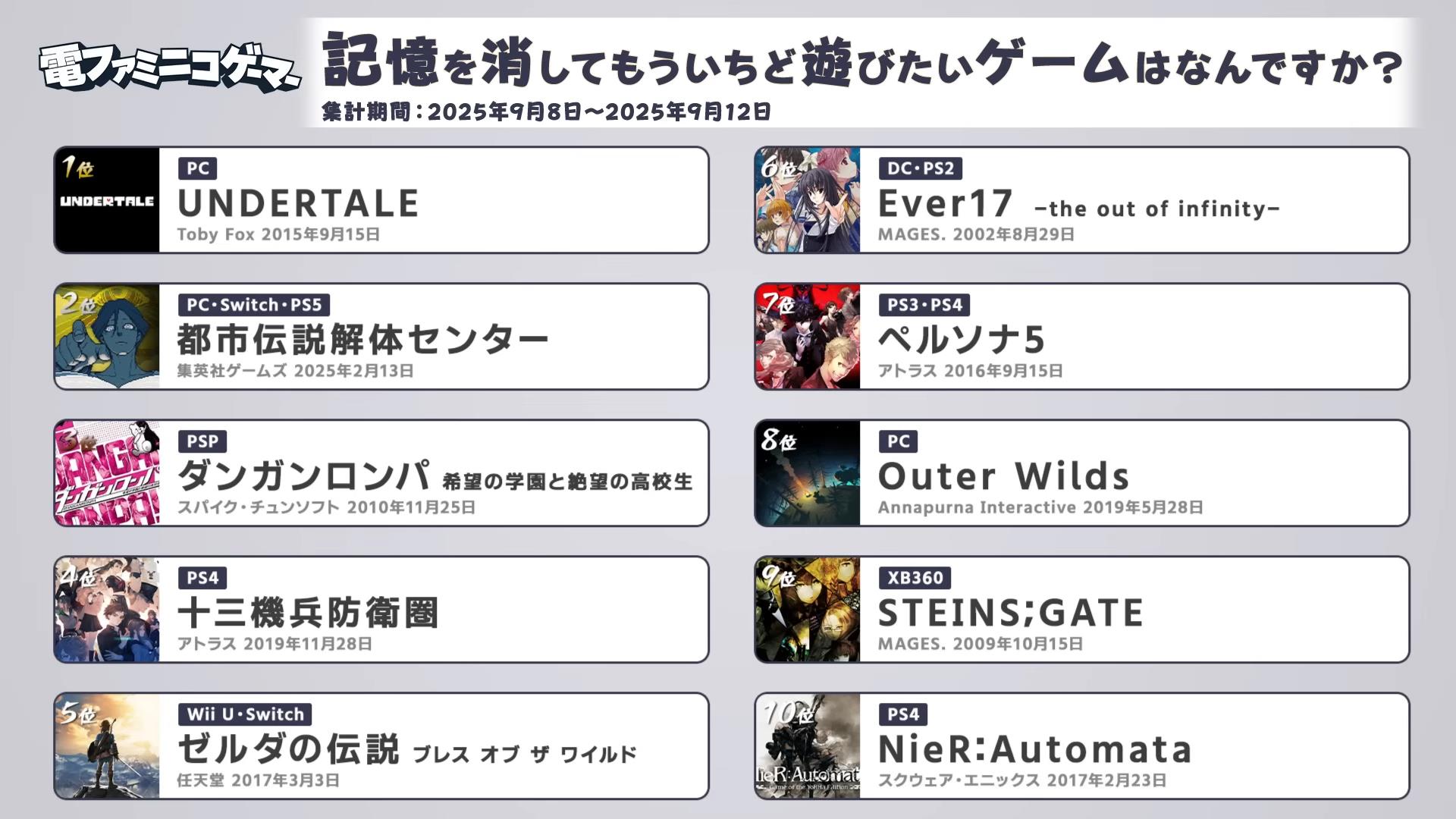 【《传说之下》夺冠!媒体公布“想消除记忆再玩一遍的游戏”投票结果】日本游戏媒体电Famicogamer近期举办了一场名为“想把记忆消除再玩一遍的游戏是什么”玩家投票。该活动吸引了约2900位玩家参与,TOP 10名单如下:
