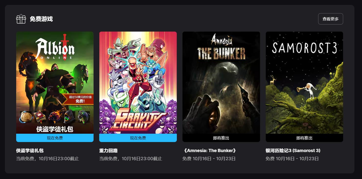 【Epic喜+2】MMORPG游戏《阿尔比恩OL》侠盗学徒礼包和2D平台动作游戏《重力回路》现已可在Epic商店中免费领取,领取后永久入库,截止时间到10月16日23:00。下周免费游戏为《失忆症:地堡(Amnesia: The Bunker)》和《银河历险记3 (Samorost 3) 》。