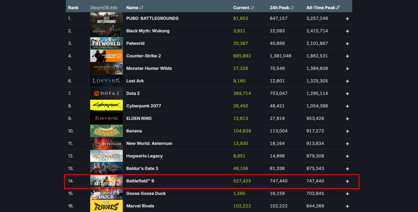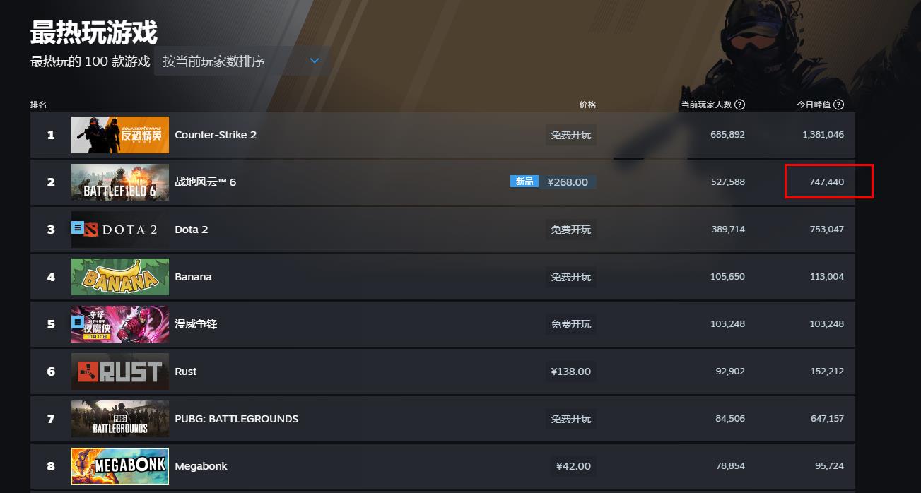 《战地6》首日在Steam上的玩家在线游玩峰值数达到了747440。该数字不仅刷新了《战地》系列的最高纪录,并且还超过了《COD》的最高值(491670)。目前本作在历史峰值榜单中位居第14,是该平台上最热玩的全价射击游戏。值得一提的是,在这个周末中,游戏的峰值可能还会进一步提升。