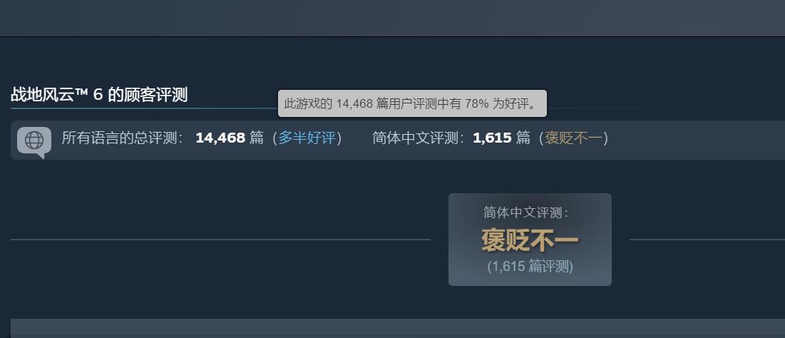 【《战地6》Steam上获玩家“多半好评”,峰值74.7万创造新纪录】由Battlefield Studios打造、EA发行的《战地6》现已正式发售。目前游戏在Steam上已有14468篇玩家评价,好评率78%,整体为“多半好评”。国区1615篇,好评率57%。在PS商店中,游戏已有28977个评价,全球玩家评分4.24,五星好评率74%。