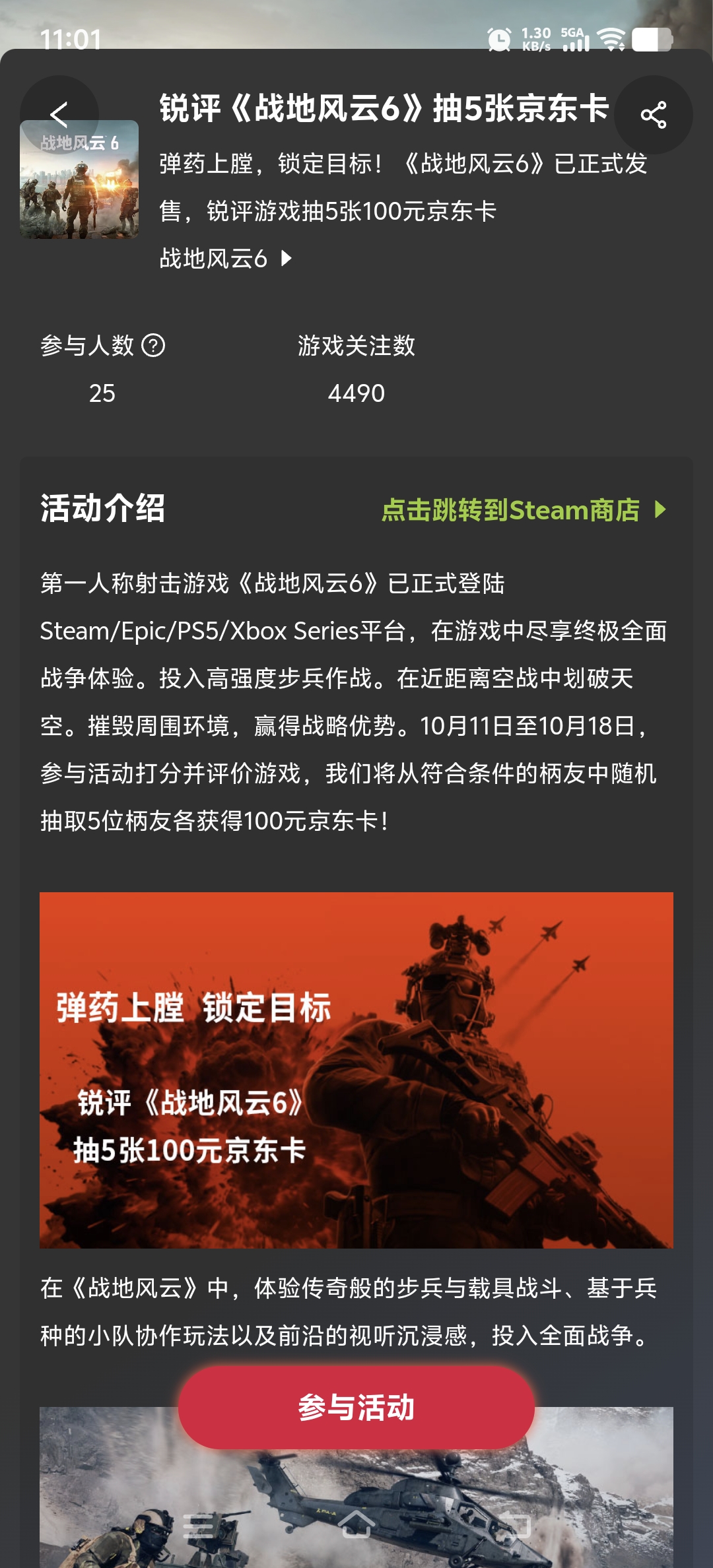 【《战地风云6》有奖评价活动发布邀请】第一人称射击游戏《战地风云6》已正式登录Steam/Epic/PS5/Xbox Series平台,我们正在举办有奖评价活动,在游戏详情页写下游玩体验,将有机会获得100元京东卡。欢迎已体验的玩家给游戏打分并评价,聊聊游戏的大战场效果、射击手感、不同的游戏模式体验、联机优化等等。您的真实评分、评价将会非常重要! 参与活动的方式: 点击此条资讯详情->点击活动专题广告即可参与