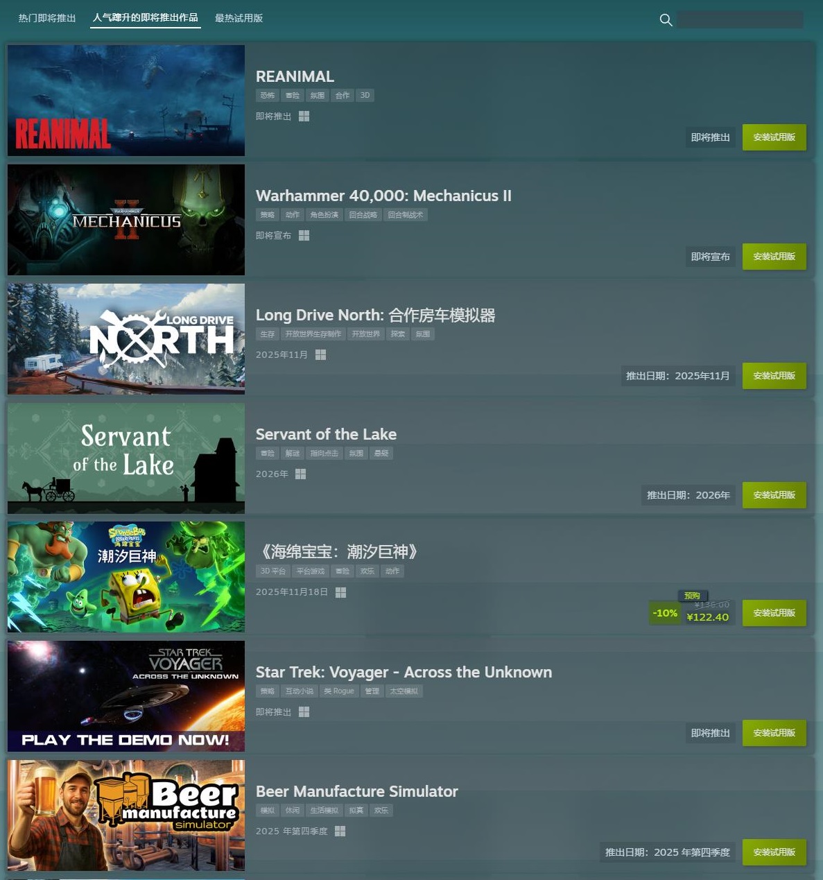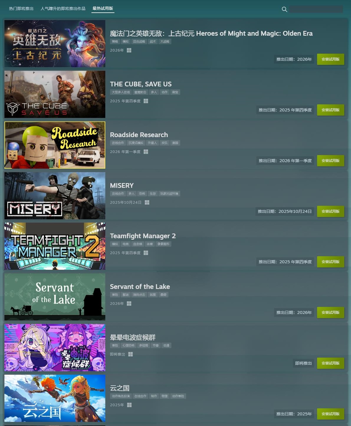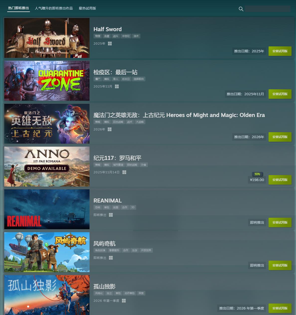 【Steam新品节现已开启,数百款游戏抢先试玩】Steam新品节(10月版)现已开启。此次活动持续到10月21日凌晨1点,期间数百款新作游戏将免费提供试玩版供玩家们抢先体验,其中包括《魔法门之英雄无敌:上古纪元》《REANIMAL》等热门作品。玩家在浏览时发现心仪的游戏可直接安装试玩,或将其加入愿望单以便游戏发行时收到通知。新品节开幕时大部分栏目为随机排序,Steam会利用活动开始后头几天里了解到的信息从周三起更好地向玩家推荐游戏。