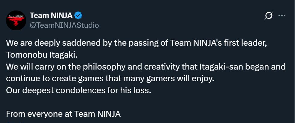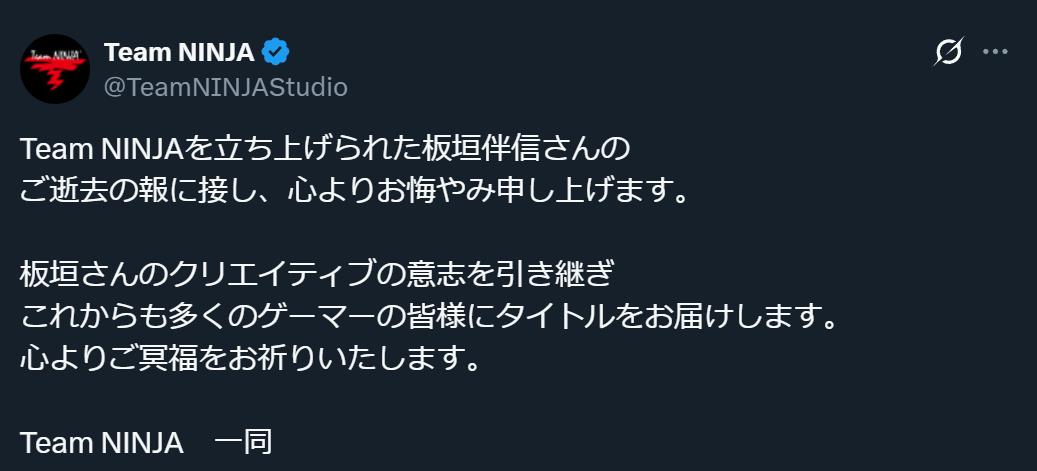 更新:Team NINJA官方对板垣伴信的离世发布悼念公告。