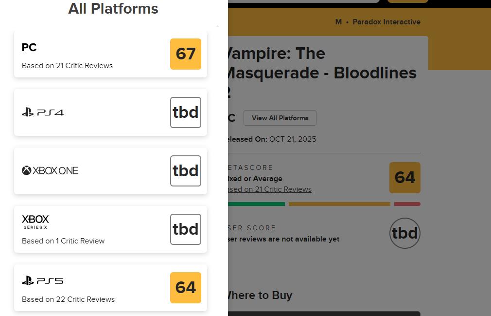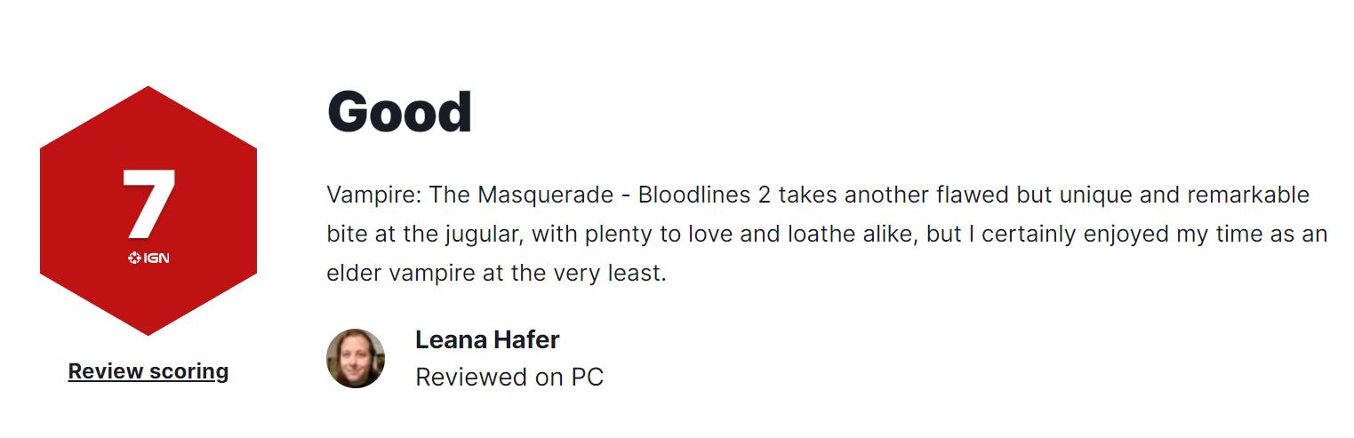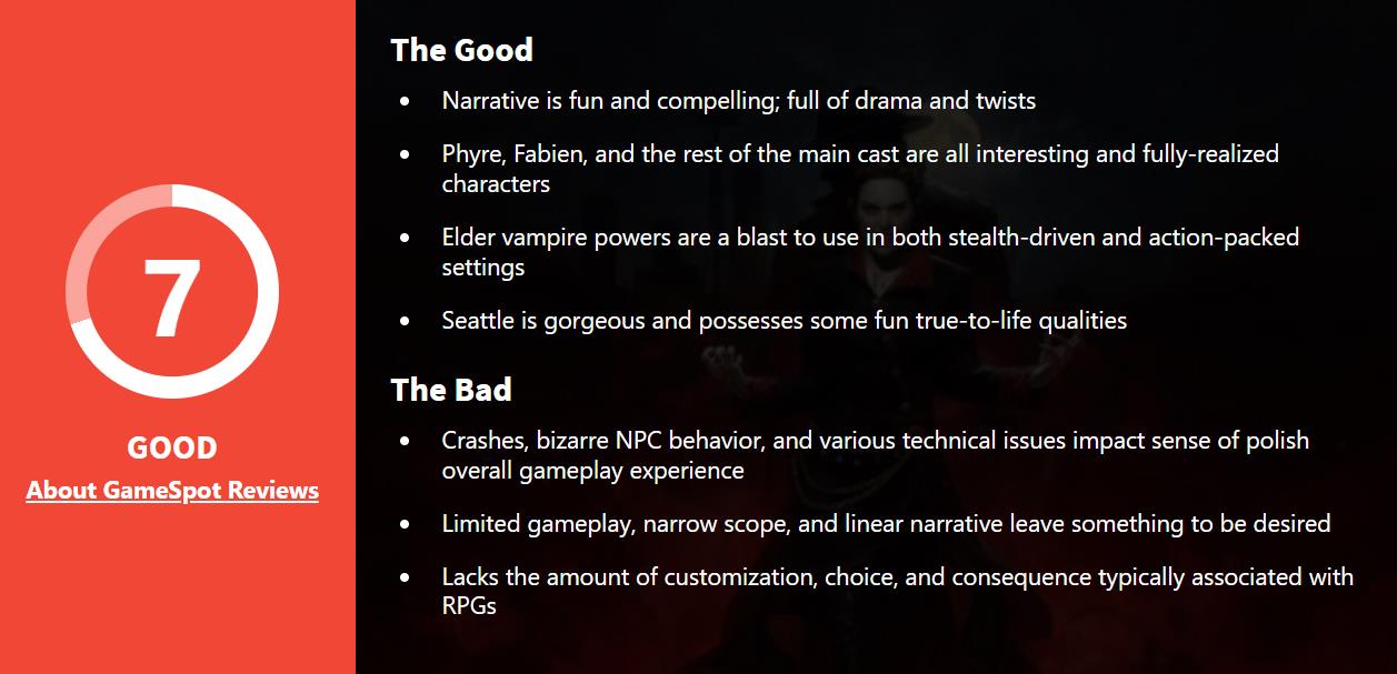 《吸血鬼:避世血族2》MC媒体均分64,获IGN和GS双7分评价