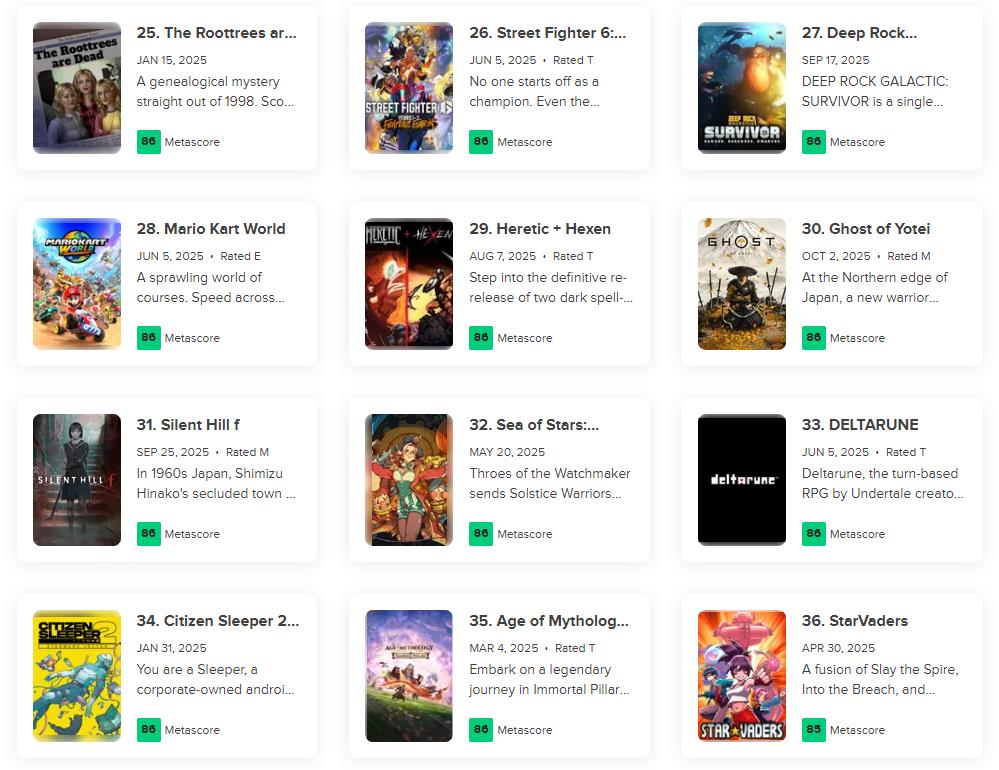 【外媒统计今年MC高分榜前50中约1/3为老游戏】海外游戏媒体TheGamer对今年MC高分游戏榜TOP 50进行了分类,统计后发现其中有16款是重制/复刻或再发行的游戏,占比约为1/3,相较于去年约20%的占比有所提升。