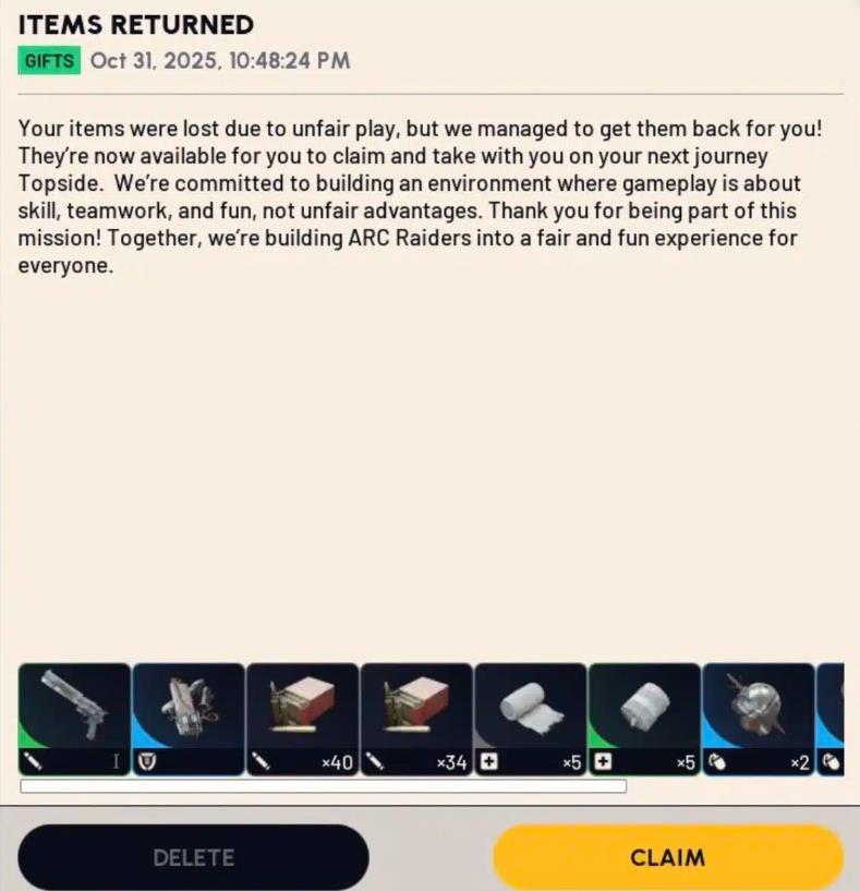 【《ARC Raiders》Steam峰值破35万!因对手作弊而损失的装备可以返还】由Embark Studios所带来的多人合作撤离冒险游戏《ARC Raiders》在上市后取得了不错的市场反馈。近日游戏在Steam上的玩家峰值再创新高,现已达到354836人。不仅如此,本作在作弊问题的处理上也获得了玩家们的称赞。近期不少用户在社区分享了“返还因对手作弊而失去的装备”的截图。其中写道:“您的物品因不公平游戏行为而丢失,我们已经帮您找回。现可领取它们并开启下一次冒险之旅。”《ARC Raiders》已登录PS5/Xbox Series/PC,开发团队承诺会在之后陆续带来更多新内容。