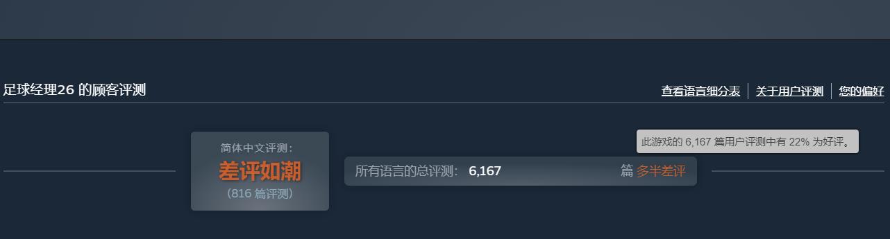 【《足球经理26》Steam玩家多半差评,最新更新已上线测试分支】由Sports Interactive使用Unity引擎打造的《足球经理26》已于昨日上线。截至目前,本作在Steam上已有6167篇评测,玩家好评率22%,整体为“多半差评”。国区816篇,好评率5%。不少玩家认为游戏新UI设计的非常不人性化,并且存在大量的BUG。