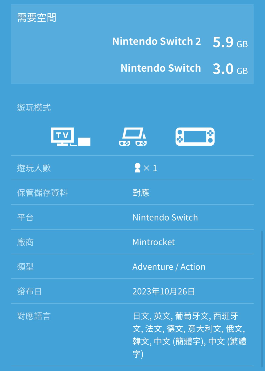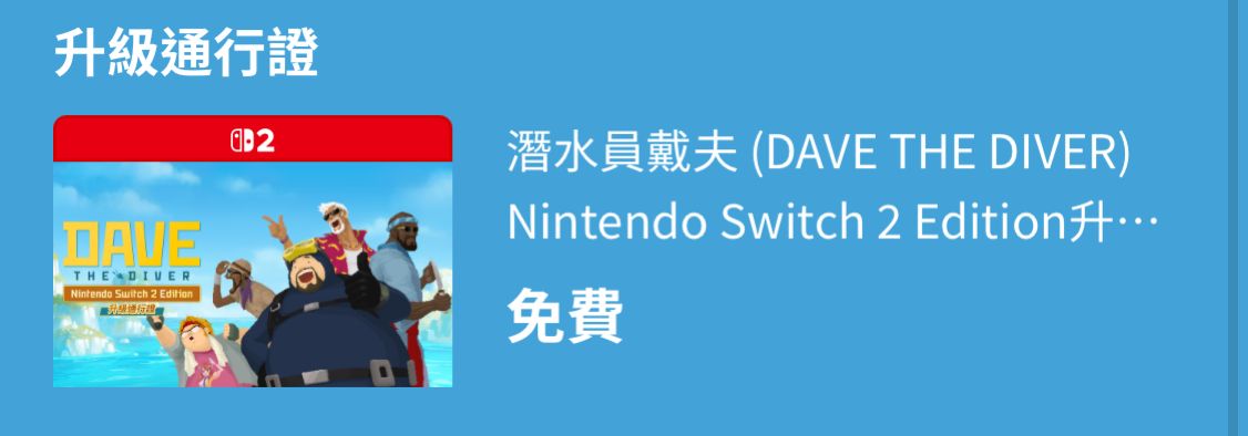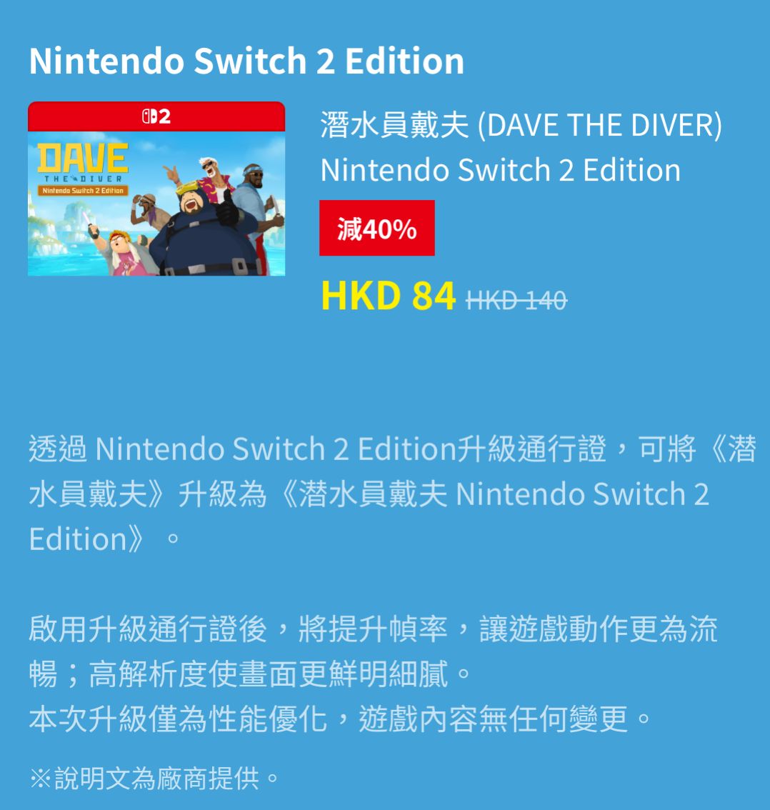 【《潜水员戴夫》NS2版现已上架,玩家可免费升级】《潜水员戴夫》NS2本现已正式上架各个地区的任天堂商店,支持通过升级包从NS版升级。升级包在港服等服务器商店为免费,在日服则为100日元。 根据商店页面描述,NS2版本《潜水员戴夫》大小为5.9GB,提升了分辨率和帧数,游戏内容则没有变化。本作现在也正在打折中,NS2版折后价84HKD。