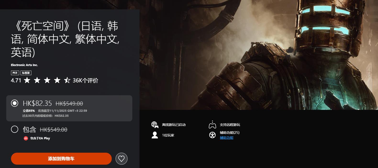《死亡空间》82.32HKD(新史低)