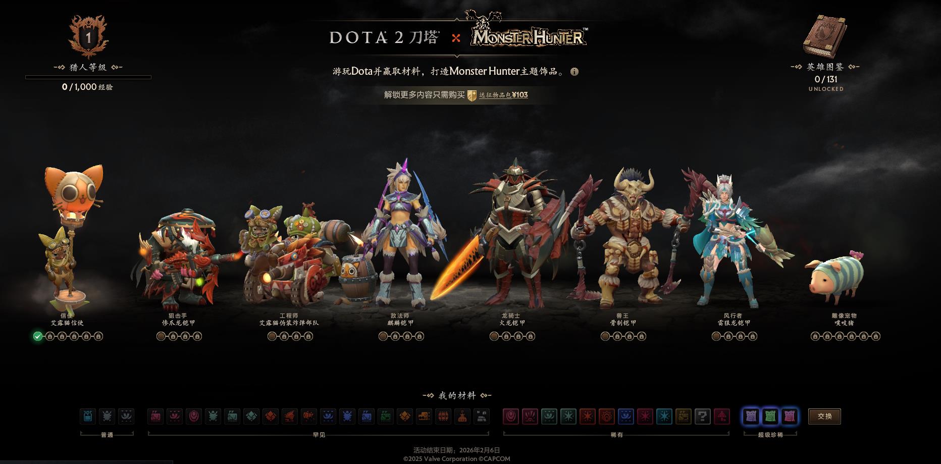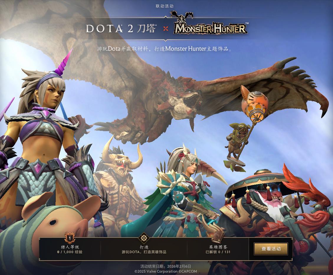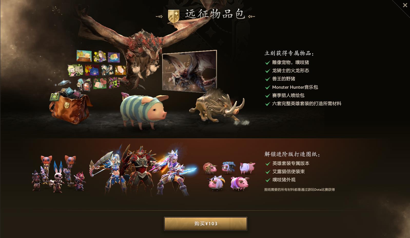 【《DOTA2》x《怪物猎人》联动今日上线!火龙龙骑霸气登场】《DOTA2》与《怪物猎人》大型联动活动已于今日上线。其中带来了艾露猫信使、宠物噗吱猪,以及全新的《怪猎》主题装备。每款英雄套装基础版对所有人免费开放,活动期间通过游玩游戏收集材料就能打造。购买远征物品包(103元)可获得升级套装素材,龙骑士“火龙”和兽王“野猪”,配乐包等内容。此外,活动期间所有玩家还可获得遗迹装饰(默认装备),装备后每局基地会随机出现冰牙、黑蚀、千刃以及雌/雄火龙。活动截至明年2月6日。