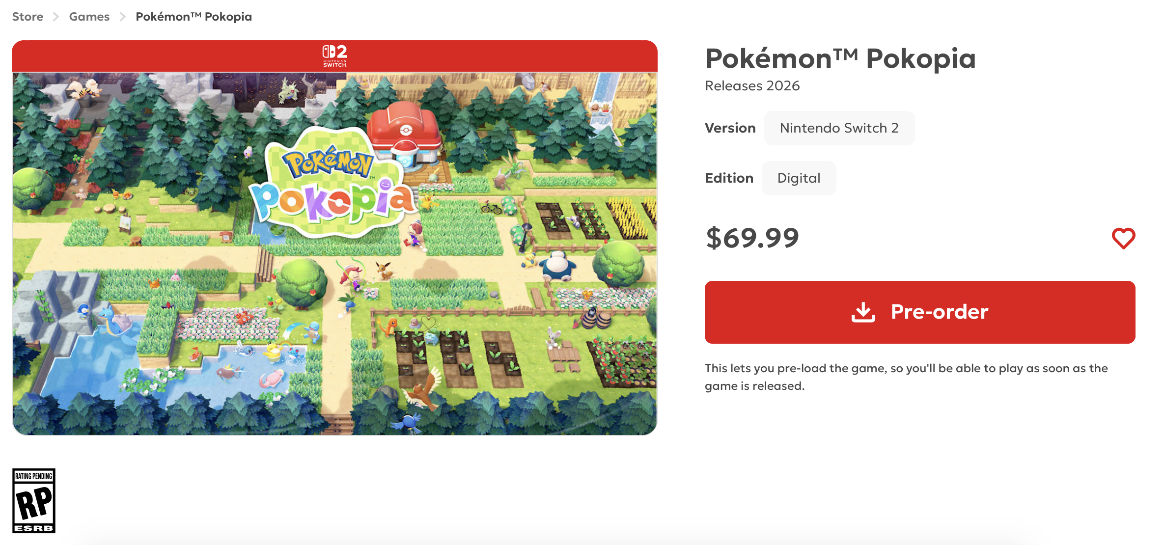 第一方首款钥匙卡NS2游戏《宝可梦Pokopia》明年3月5日发售