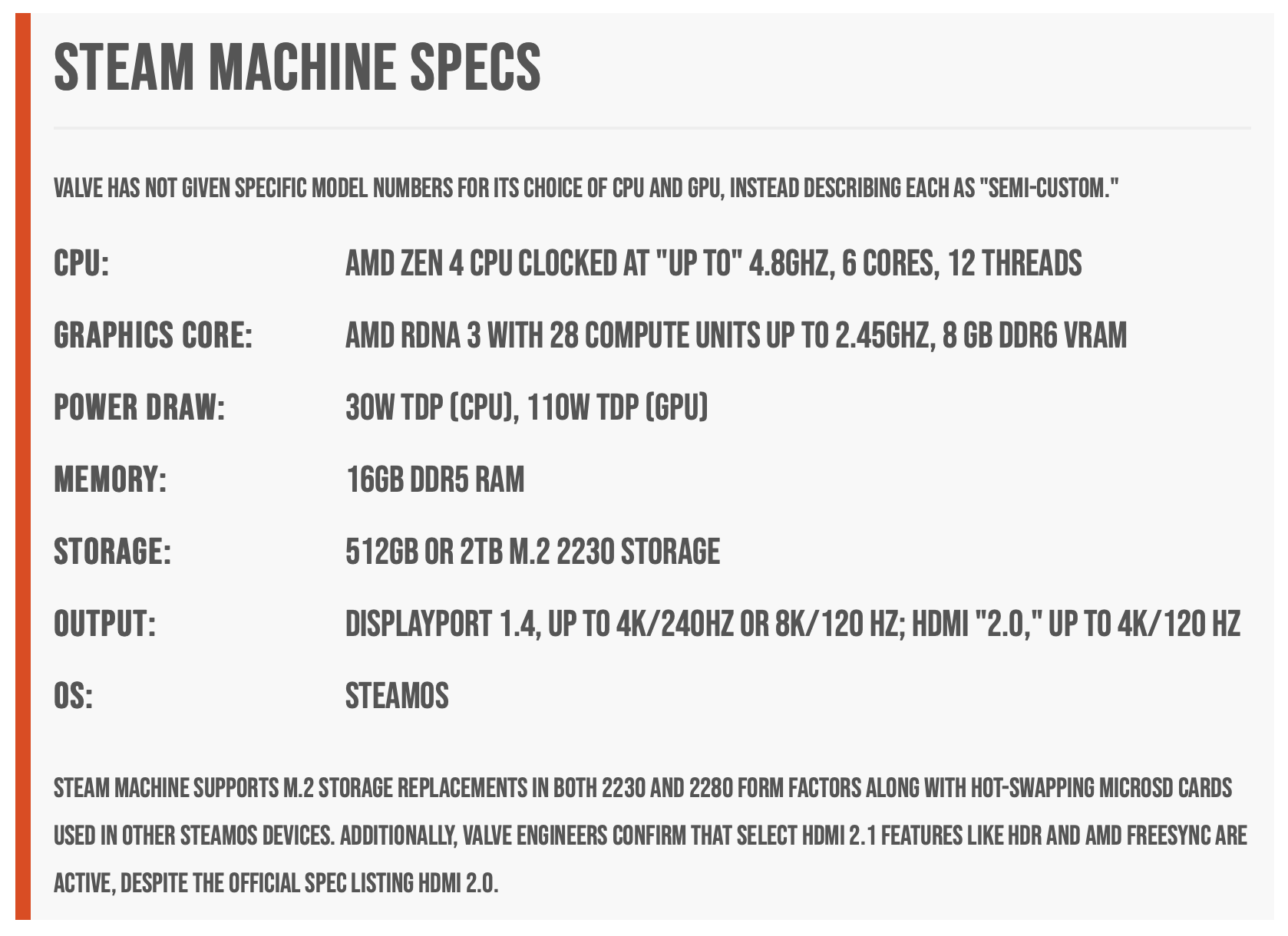 1.Steam Machine由Valve自行制造并销售。根据目前的规格表,它的性能大约介于Xbox Series S与标准版PS5之间,甚至在某些方面更接近PS5,但也存在一些前提条件。