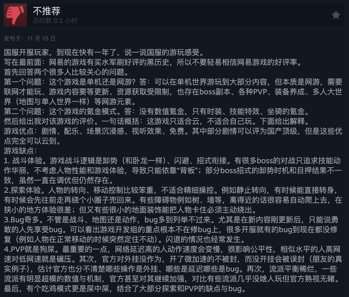 【《燕云十六声》Steam评价“褒贬不一”,游戏尚需优化】《燕云十六声》登陆Steam后,目前已收获1931条玩家评价,其中67%为好评,综合评价为“褒贬不一”。支持者普遍认为游戏剧情动人、角色建模精致、细节表现出色,音乐与音效同样为整体体验增色。不少玩家也肯定了其氛围营造与叙事质感。不过也有玩家指出,游戏在性能优化方面仍显不足,存在较多Bug,PVP模式中延迟偏高,部分流派之间的数值与机制平衡仍需改进,技术层面的体验仍有提升空间。