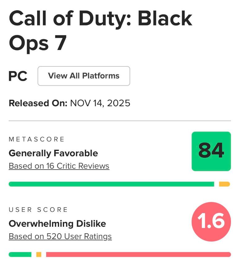 【《COD:黑色行动7》MC用户评分1.6,创系列主要作品最低纪录】《COD:黑色行动7》已于上周正式发售。虽然本作在MC上目前有着83的媒体均分,不过用户评分只有1.9,在系列主要作品中处于垫底的状态。即便是媒体均分56的《现代战争3》也有着2.3的用户评分。
