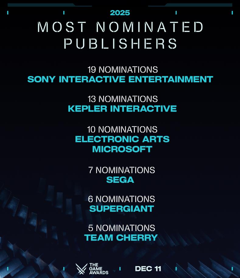 【SIE成为本届TGA提名最多的发行商】2025年TGA提名名单已于今日揭晓,SIE以19项提名成为本届活动中获提名数量最多的发行商。其中《死亡搁浅2:冥滩之上》《羊蹄山之魂》合计贡献了14项提名,其余5项则来自《绝地潜兵2》《漫威金刚狼》,以及影视作品《直到黎明》《最后生还者》第二季。