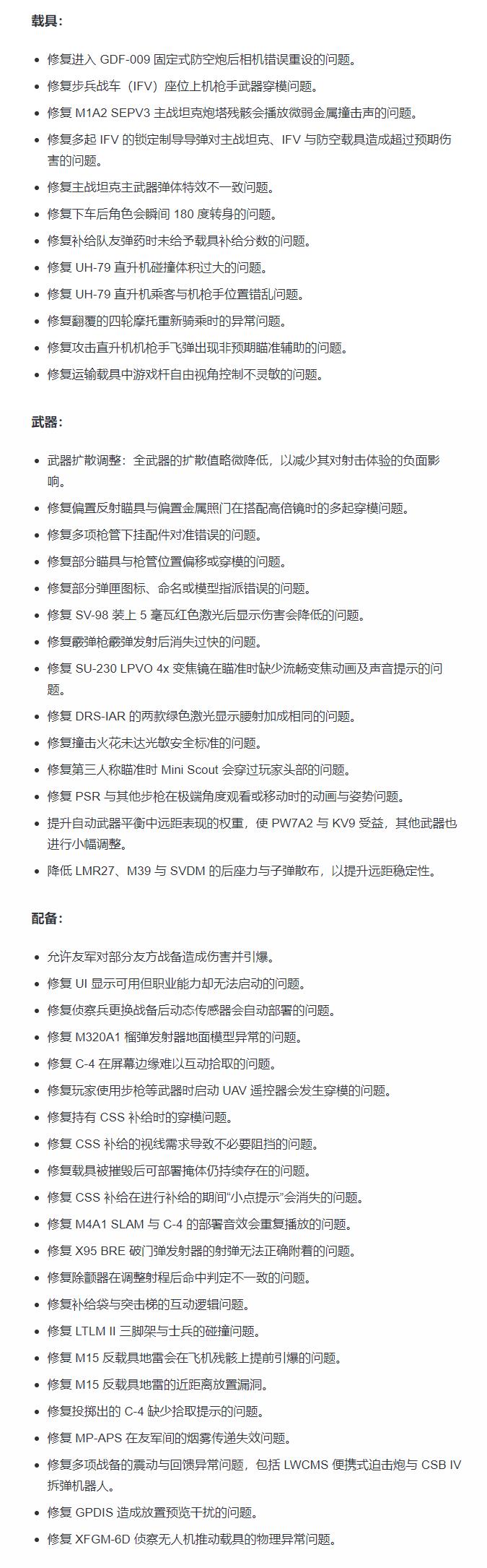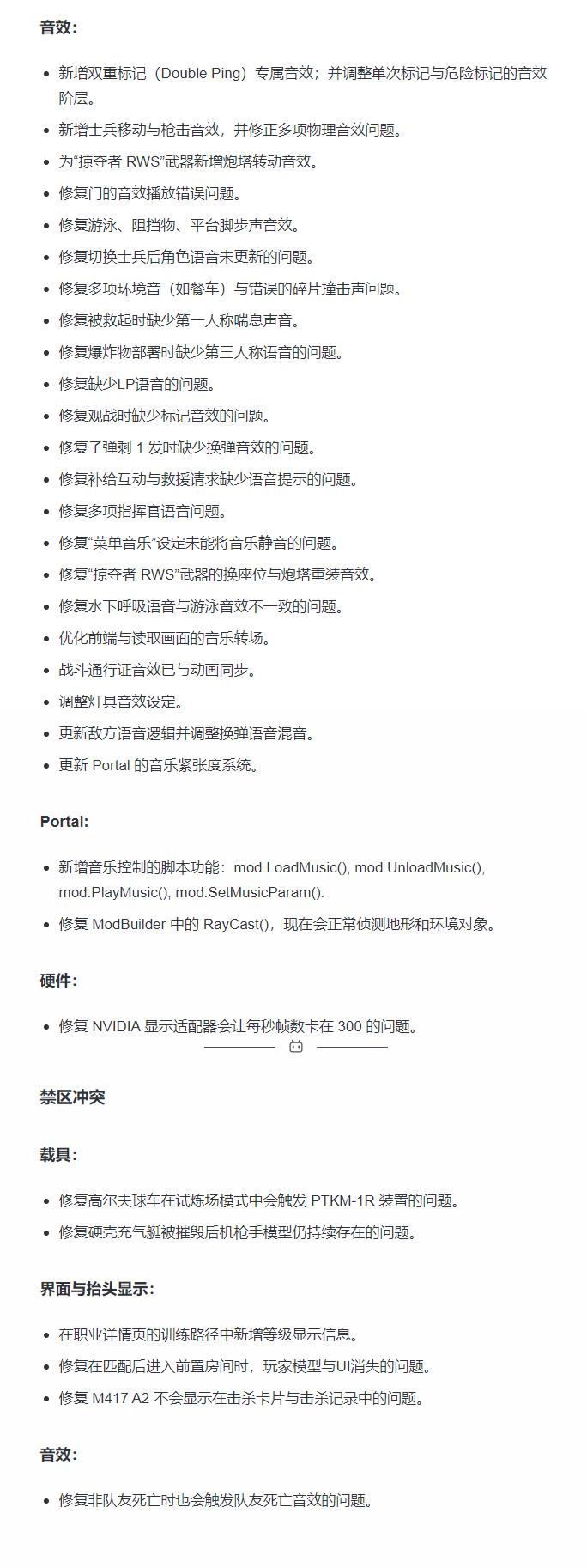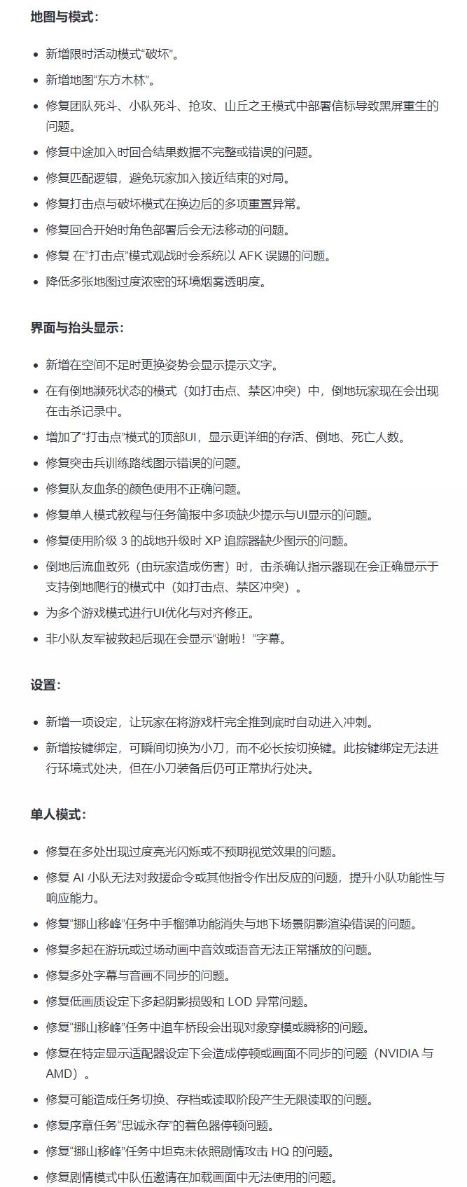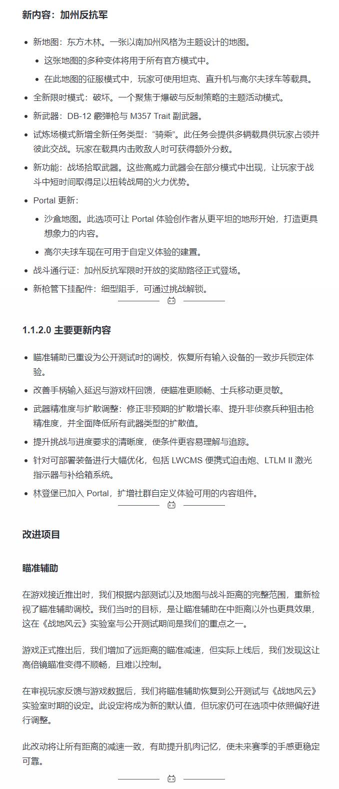 【《战地6》S1第二段更新上线:新地图“东方木林”及限时模式等内容到来】《战地6》赛季1第二段更新(V1.1.2.0)于今日推送。此次更新带来了新地图“东方木林”、 限时模式“破坏”、新武器“DB-12霰弹枪”“M357 Trait副武器”、新功能“战场拾取武器”以及Portal更新等内容。此外,更新还针对士兵操作回馈、瞄准一致性、操作表现,以及整体游戏稳定性进行了大幅优化。重新调整瞄准辅助行为,并根据社群反馈修复大量武器、装备与载具问题(完整说明详见附图)。《战地6》赛季1第三段更新预计12月9日上线,届时会追加地图“冰锁帝国之州”等新内容。