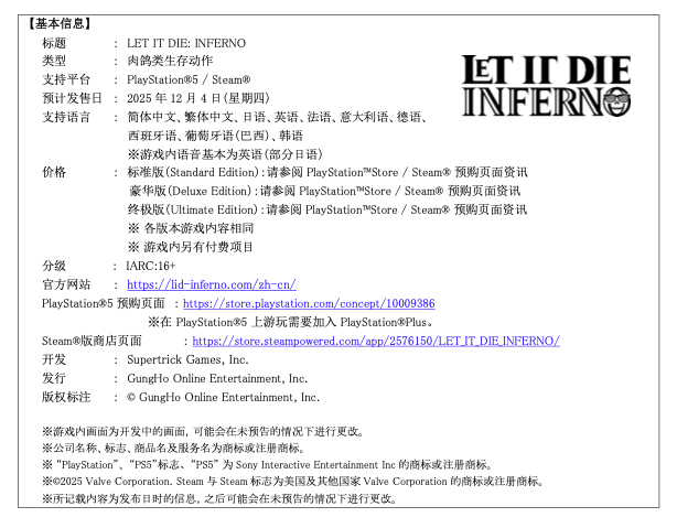 GungHo Online Entertainment, Inc.宣布了与 SUPERTRICK GAMES, Inc.携手打造,将于 2025 年 12 月 4 日(星期四)发售的肉鸽类生存动作游戏《LET IT DIE: INFERNO》的最新资讯。