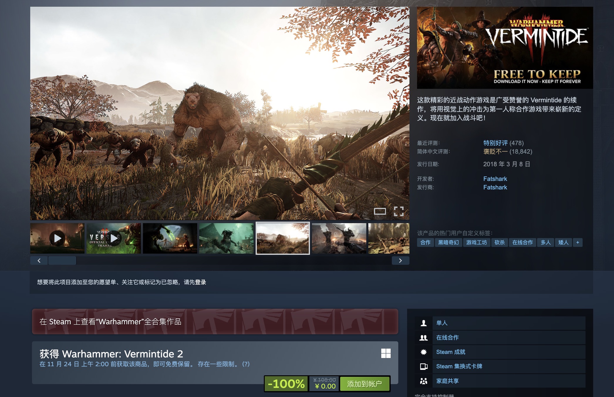 喜加一!《战锤:鼠疫2》Steam免费入库