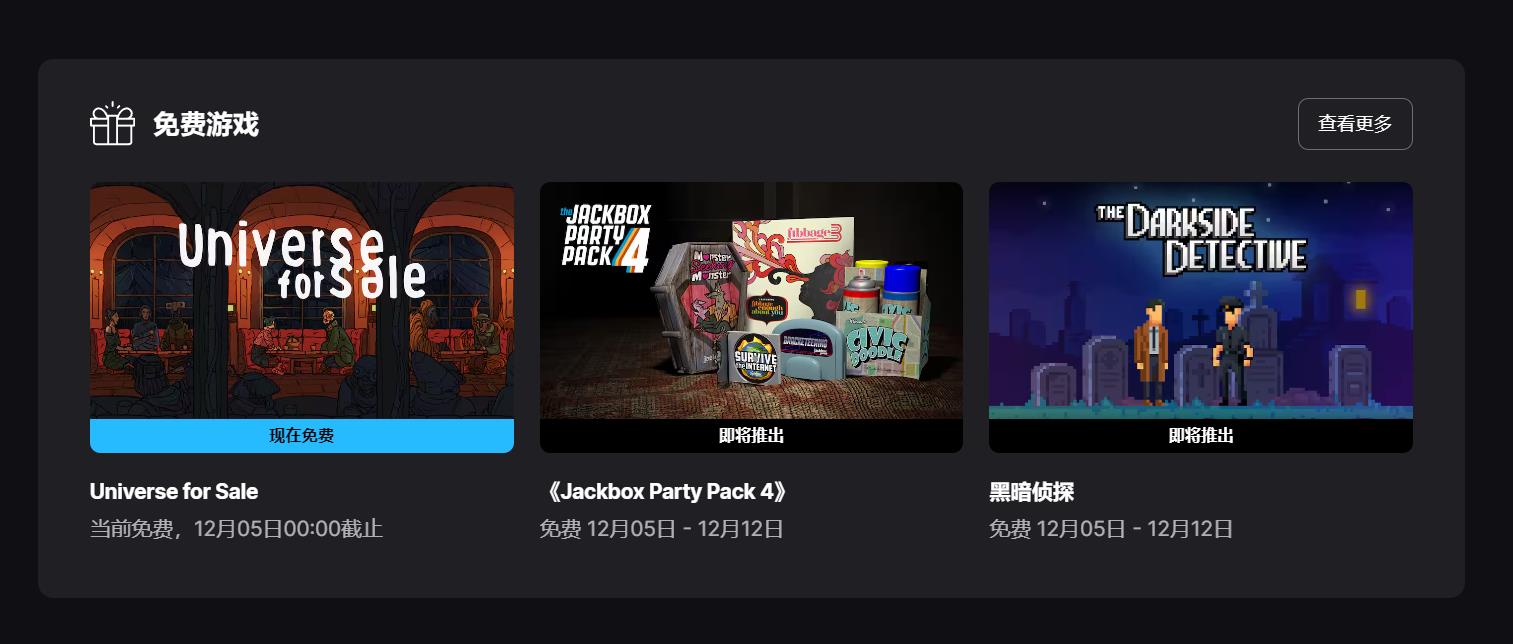 【Epic喜+1】手绘风冒险游戏《出售宇宙(Universe for Sale)》现已可在Epic商店中免费领取,领取后永久入库,截止时间到12月5日00:00。下周免费游戏为《黑暗侦探》和《Jackbox Party Pack 4》。