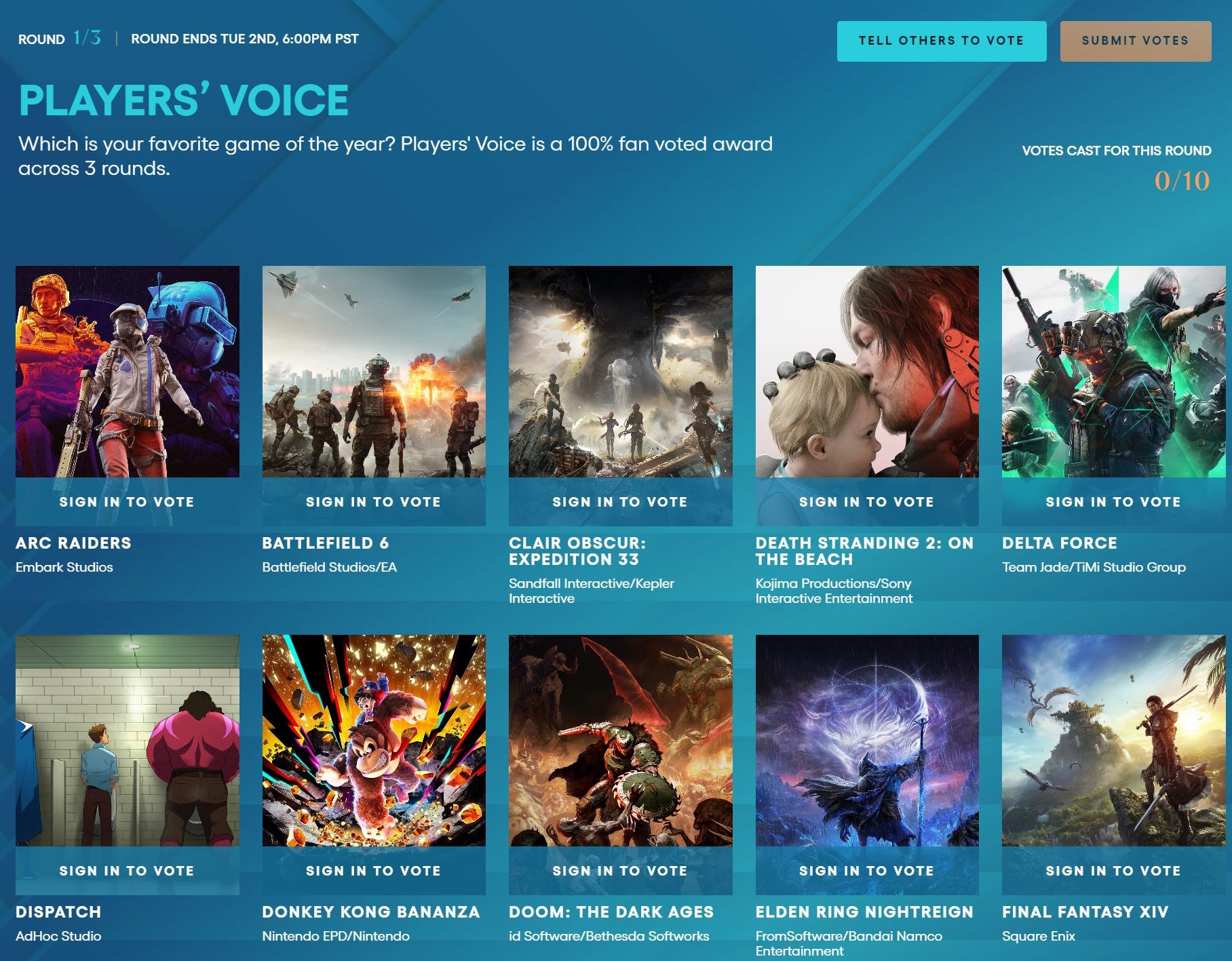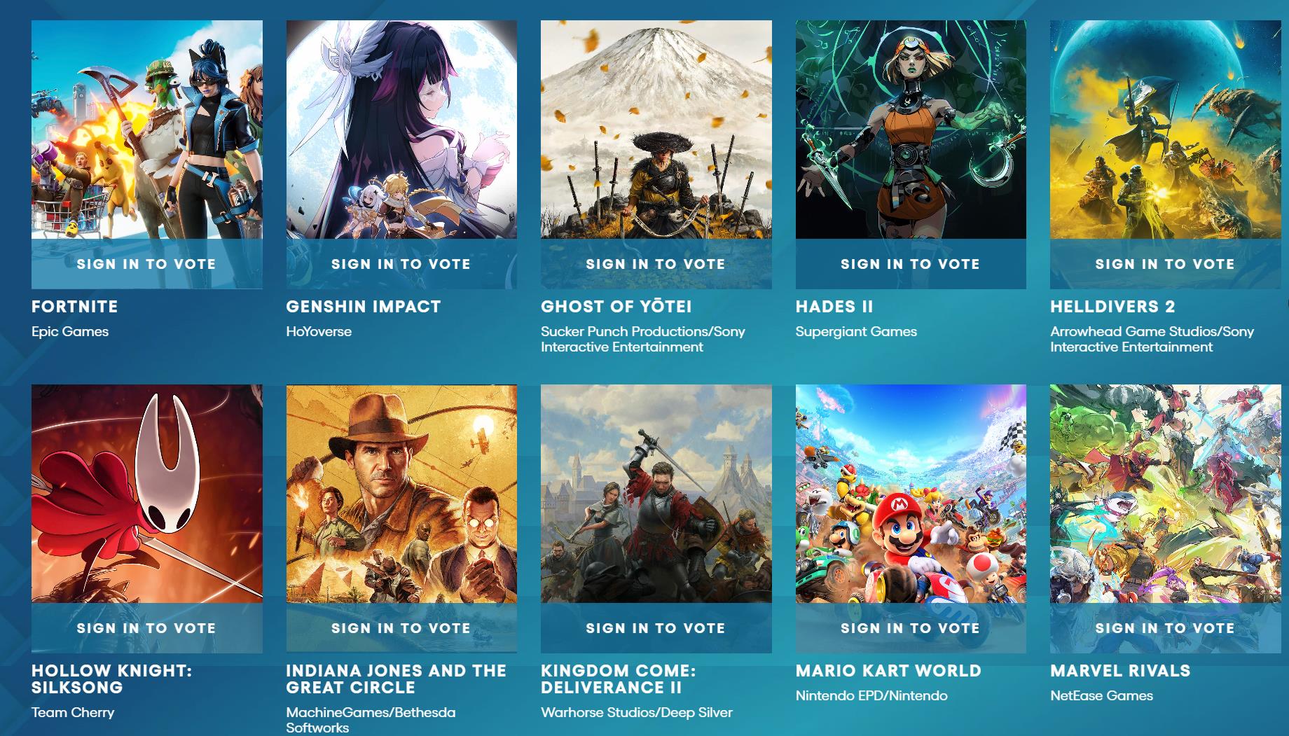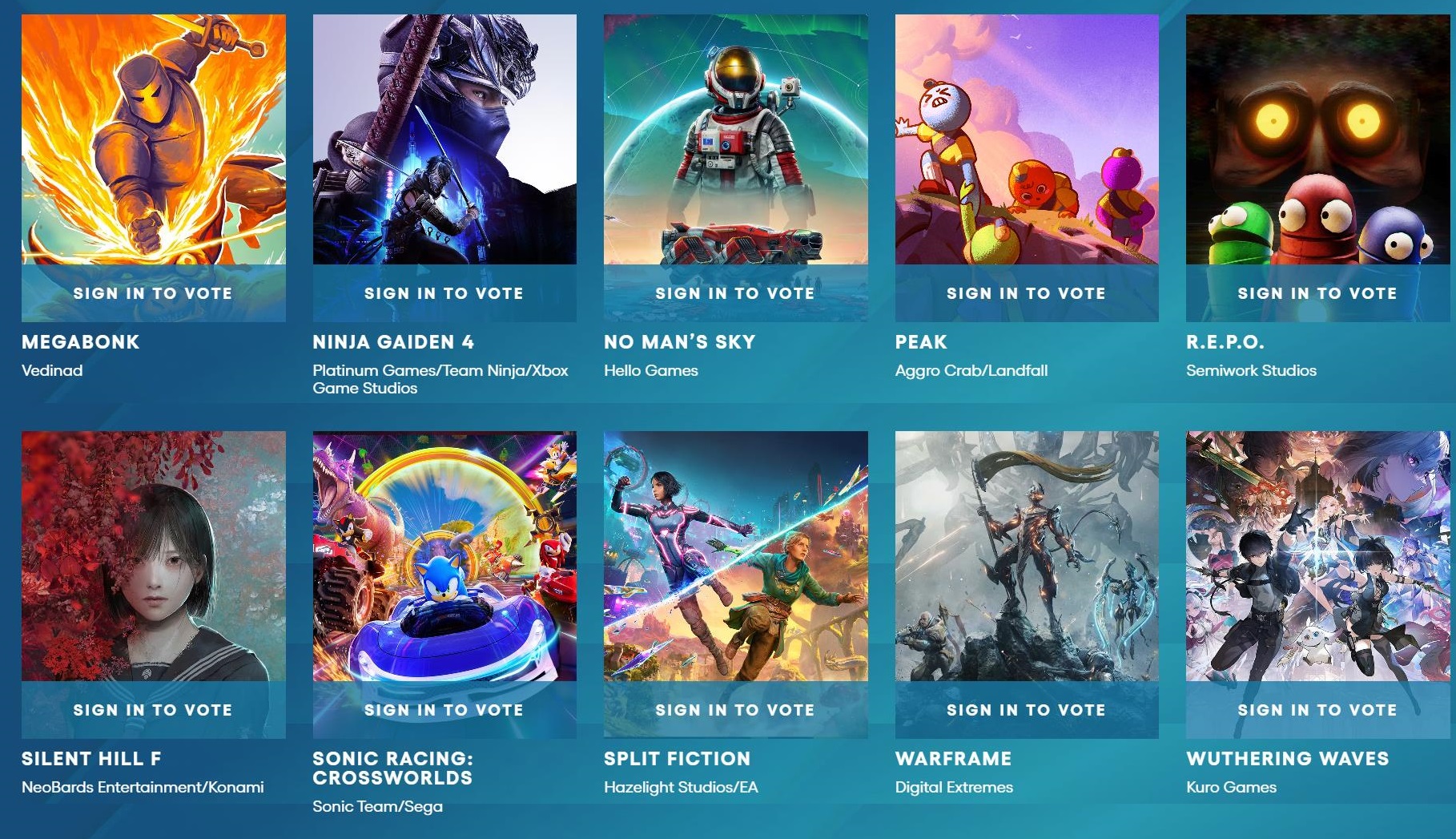 入围游戏包括:《ARC RAIDERS》《战地6》《光与影:33号远征队》《死亡搁浅2》《三角洲行动》《超英派遣中心》《咚奇刚:焦力全开》《毁灭战士:黑暗时代》《艾尔登法环:黑夜君临》《最终幻想14》《堡垒之夜》《原神》《羊蹄山之魂》《黑帝斯2》《绝地潜兵2》《空洞骑士:丝之歌》《夺宝奇兵:古老之圈》《天国:拯救2》《马力欧赛车:世界》《漫威争锋》《MEGABONK》《忍者龙剑传4》《无人深空》《顶峰》《R.E.P.O.》《寂静岭f》《索尼克赛车:交叉世界》《双影奇境》《星际战甲》《鸣潮》
