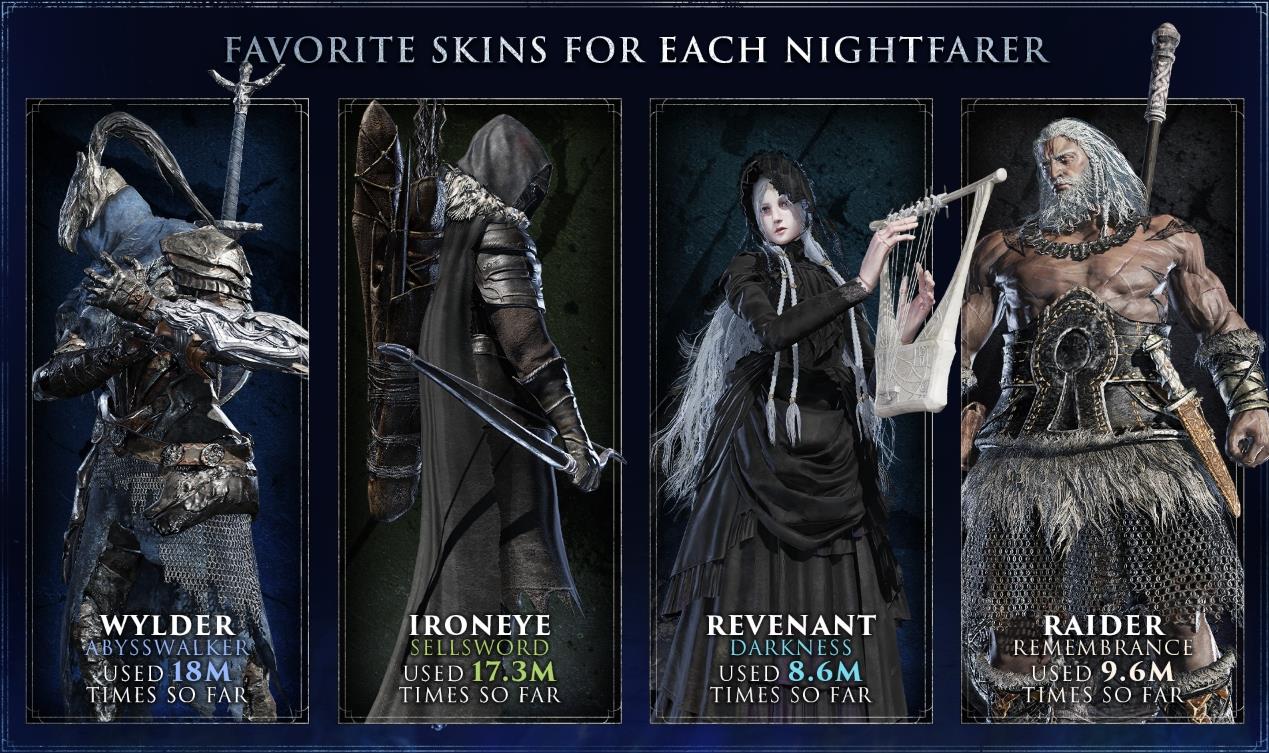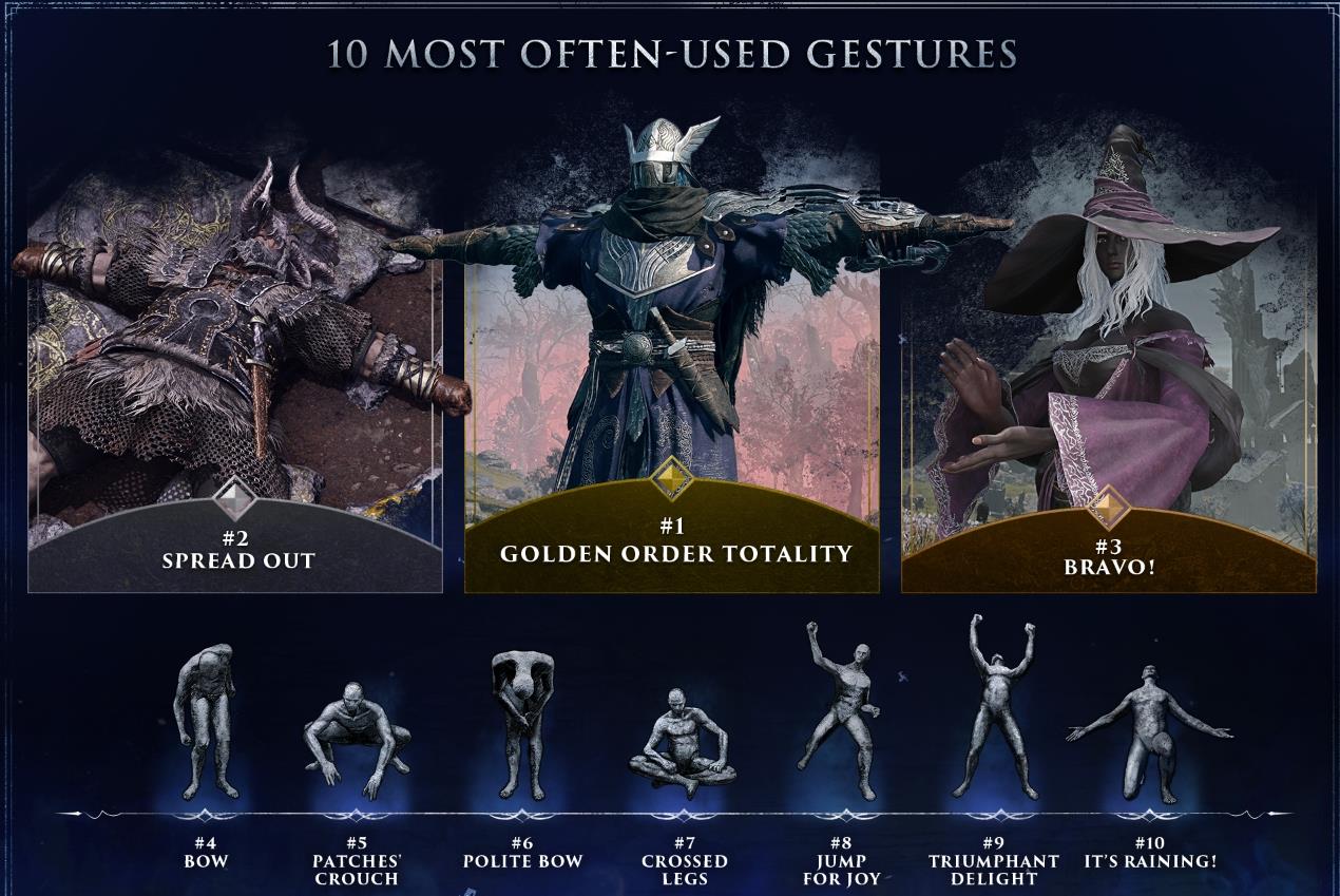 【《艾尔登法环:黑夜君临》玩家数据公开:仅3%的人到达深度5】万代南梦宫公布了《艾尔登法环:黑夜君临》的玩家数据,具体如下: 1、造成玩家死亡次数最多的野外BOSS排名:卡里安骑士位居首位(图1)。 2、深度到达率:仅3%的玩家到达深度5(图2)。 3、各角色人气皮肤(图3/4)。 4、玩家救助数12亿次(图5)。 5、最常用的10种动作(图6)。