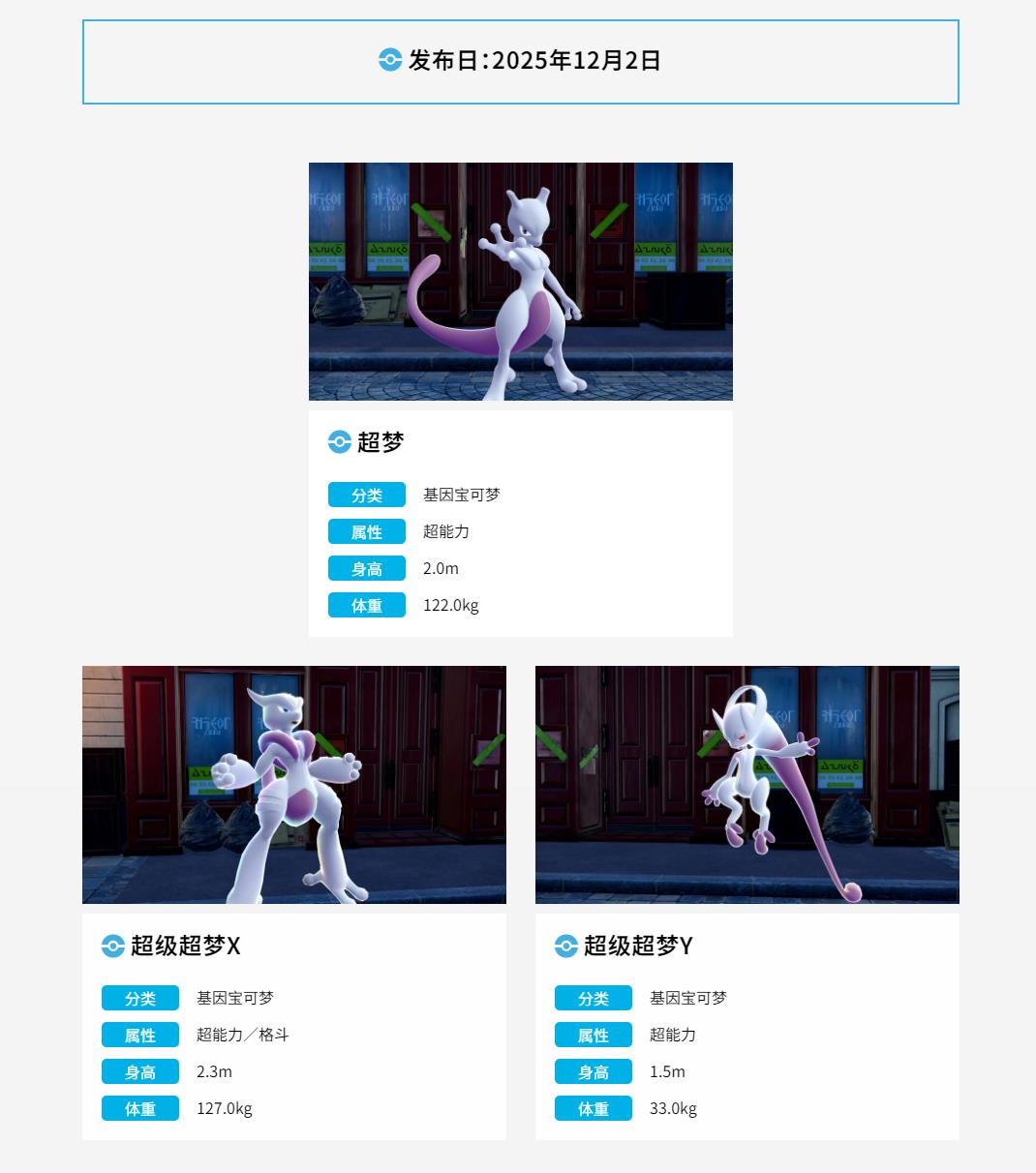此外,12月2日起,将发布能在《宝可梦传说 Z-A》遇见传说的宝可梦“超梦”的EX副任务“M项目”。玩家可通过“神秘礼物”获取“超梦进化石X”和“超梦进化石Y” 后前往弗拉达利咖啡店触发任务。《宝可梦传说 Z-A》现已在NS/NS2上推出,“超次元爆涌”预计于12月10日发售。