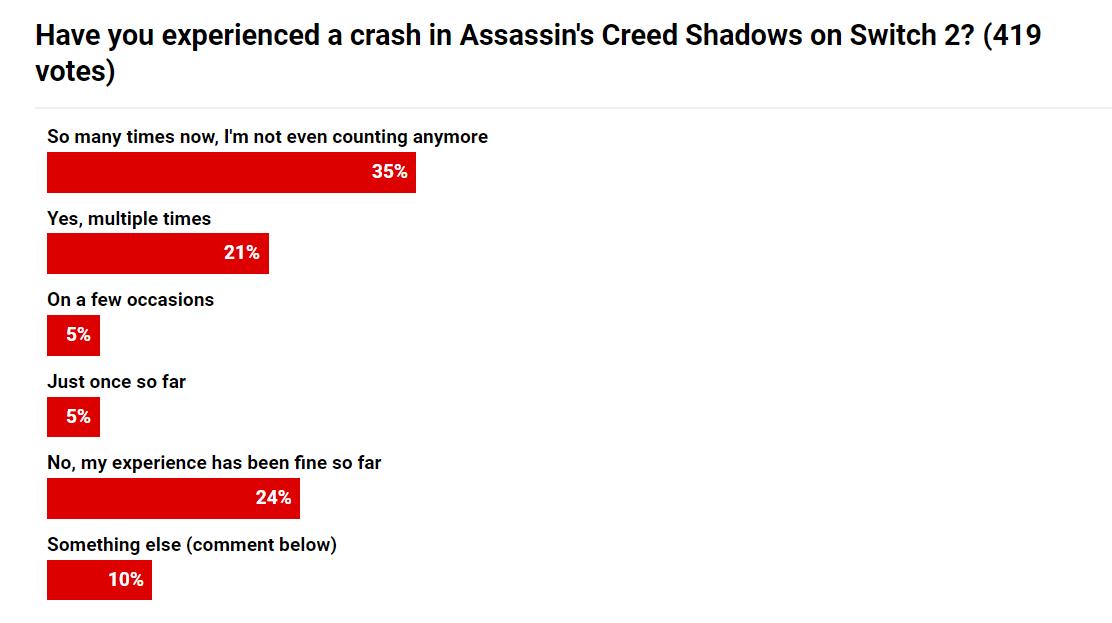 【官方确认NS2版《刺客信条:影》存在稳定性问题,承诺下周更新修复】《刺客信条:影》已于近期登陆新平台NS2,不少玩家体验后表示在游玩过程中频繁出现崩溃问题。根据Nintendo Life的问卷调查显示,66%的用户至少碰到过一次,56%的玩家遇到多次。
