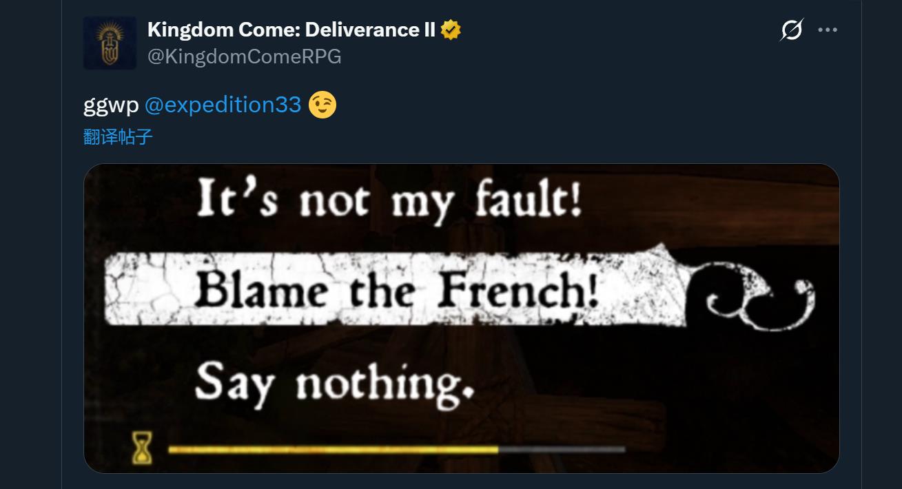 【“都怪法国佬”《天国:拯救2》官方发文恭喜《光与影:33号远征队》斩获年度大奖】在《光与影:33号远征队》斩获今年TGA年度游戏大奖后,《天国:拯救2》官方第一时间通过社交媒体送上了祝贺。战马工作室也延续了一贯的整活风格——不仅在动态中打出“ggwp”,还在配图中引用了游戏里“都怪法国佬”这一选项,幽默感十足。《天国:拯救2》入围了本届TGA年度游戏、最佳叙事以及最佳RPG等多项重磅提名,但最终遗憾未能夺得任何奖项。