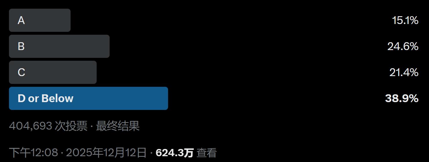 【TGA满意度问卷结果:近四成玩家给出“D或以下”评价】2025年游戏大奖(The Game Awards)已于昨日落幕。活动结束后,主持人Geoff Keighley随即在社交媒体上发起了一项关于本届颁奖典礼的满意度问卷调查。目前结果揭晓,此次调查共有404693人参与投票,具体比例如下:
