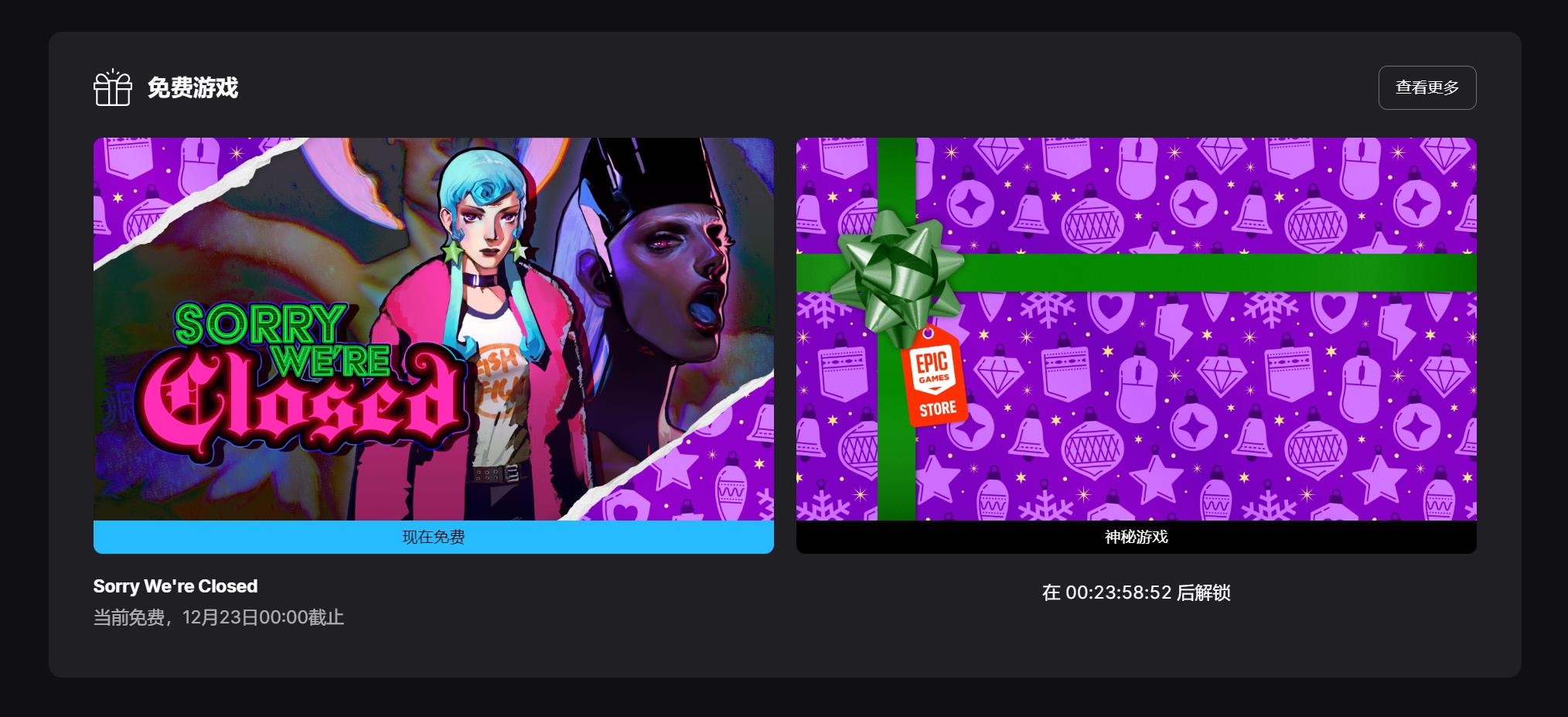 【Epic喜+1】Epic商店连续“喜+1”第5弹揭晓!古怪离奇剧情向生存恐怖游戏《抱歉我们打烊了(Sorry We're Closed)》现已可在Epic商店中免费领取,12月23日00:00截止(限时24小时),领取后永久入库。