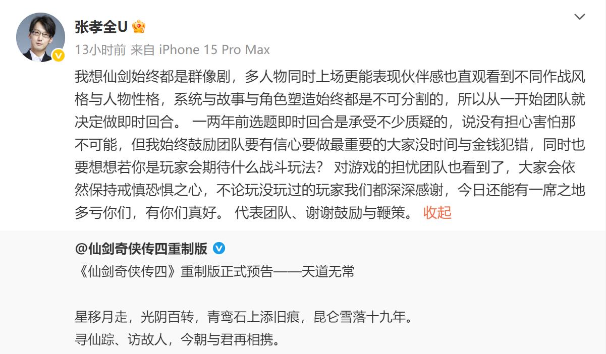 【《仙剑奇侠传四:重制版》制作人解释为何采用“回合制”设计】《仙剑奇侠传四:重制版》正式预告已于昨日发布,其中确认了本作将采用经典的回合制战斗。随后制作人张孝全在微博上解释了使用该经典设计的缘由,他表示: