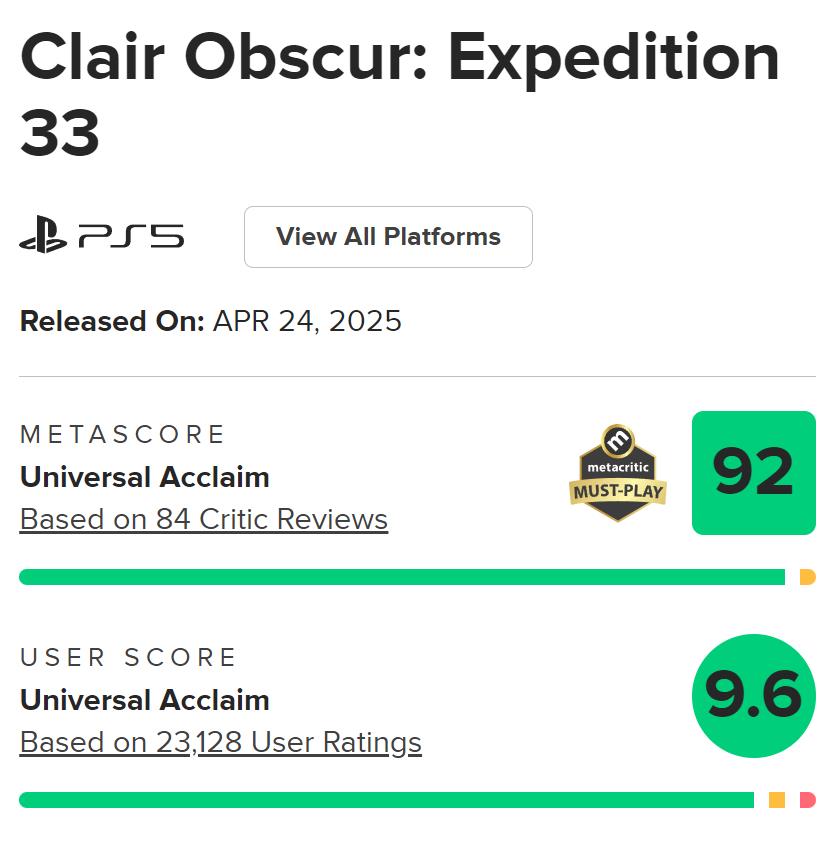 《光与影:33号远征队》团队:游戏反响超预期,原预估分数约80