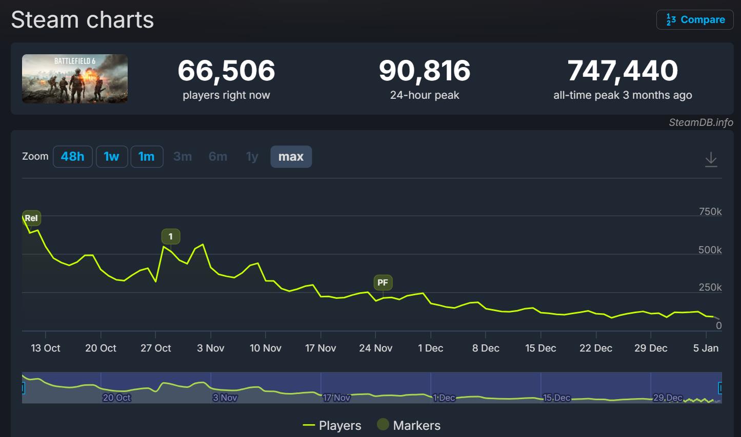 【《战地6》Steam上玩家在线峰值人数现已跌破10万】尽管《战地6》在发售时取得了不错的成绩,但随着时间推移,玩家流失逐渐加剧。根据SteamDB数据显示,本作在Steam上的同时在线玩家峰值数已跌至90816人。相比发售时最高峰747440人,玩家留存率约为12.2%。作为对比,同期发售的《ARC Raiders》最高峰值481966人,近期仍能保持在466372人。目前官方尚未公布《战地6》今年的更新计划。不知大家觉得未来通过更新能否为本作带来新的活力呢?