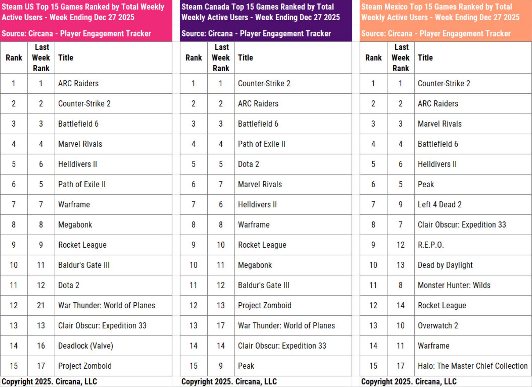 PS平台的作品和顺序连续两年完全没有任何变化,Xbox平台虽然前五作品相同,但具体名次略有调整。相比之下,Steam平台的榜单则有所不同,其中新作《ARC Raiders》《战地6》成功上榜(详见附图)。