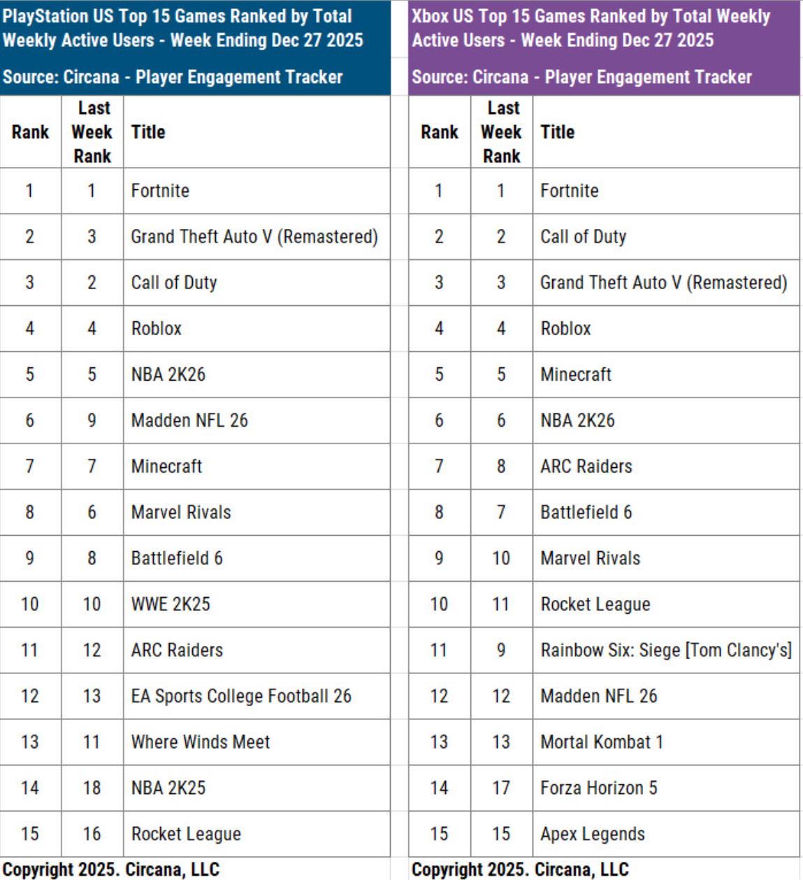【一年过去还是它们!美国地区2025年主机热游TOP5连续两年未变】Circana分析师Mat Piscatella分享了2025年美国地区热门游戏排行榜(按活跃用户参与游戏的百分比排名)。其中在PS和Xbox平台上,前五作品名单与2024年完全相同。它们分别是: