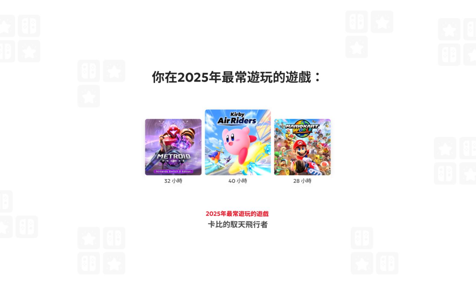 【任天堂Switch 2025年度回顾页面上线】任天堂现已上线Switch 2025年度回顾页面。玩家登录任天堂账号后,即可查看自己在过去一年的游戏数据,包括最常游玩的游戏、偏好的游戏类型、每月游玩时长以及详细的月度游玩记录等内容。 不仅如此,玩家还可以回看自2017年以来的历年Switch游戏记录。包括首次游玩Switch时间、每一年的游玩数据等信息。需要注意,2025年度回顾页面将开放至2026年2月17日,感兴趣的玩家不要错过哦。