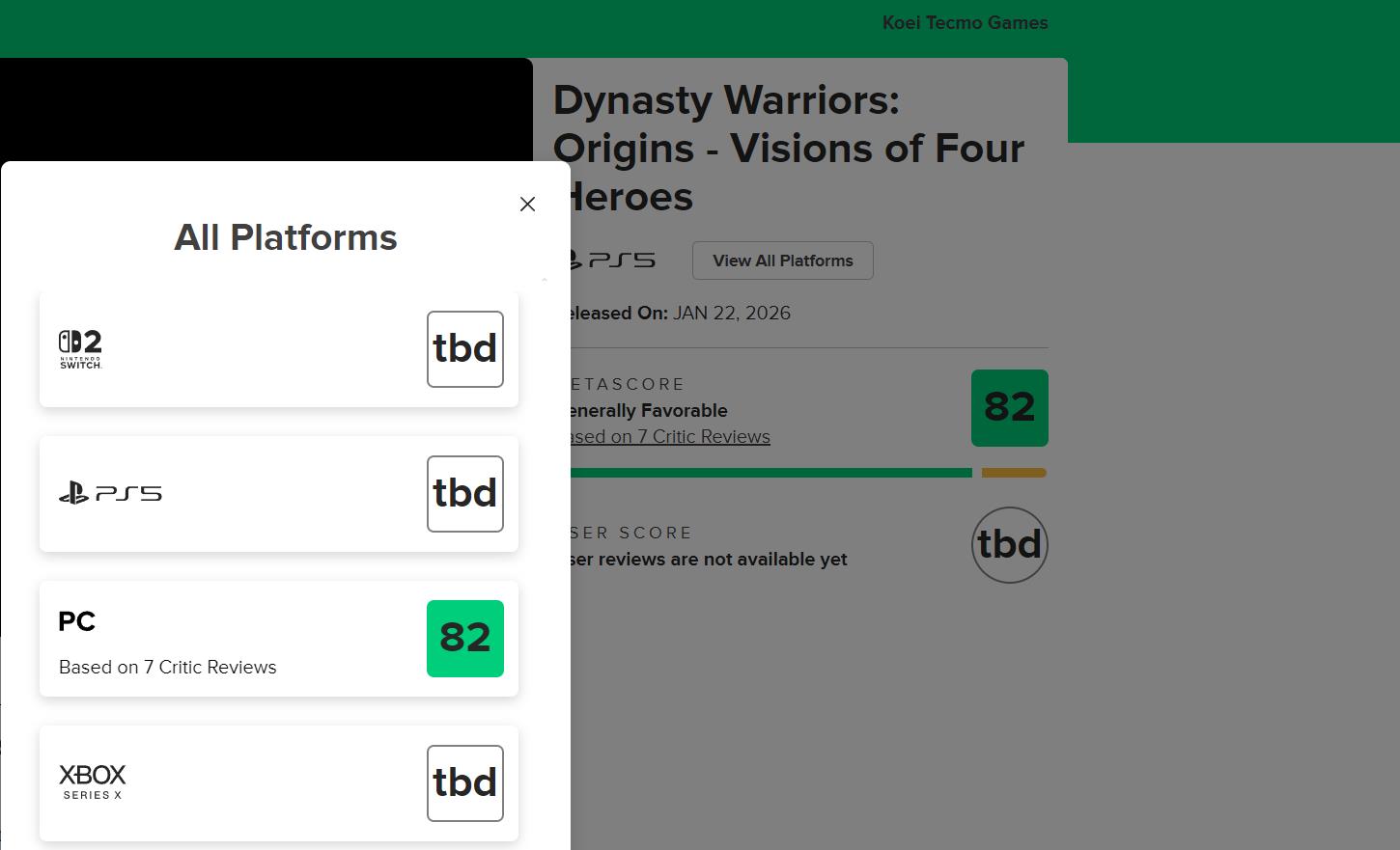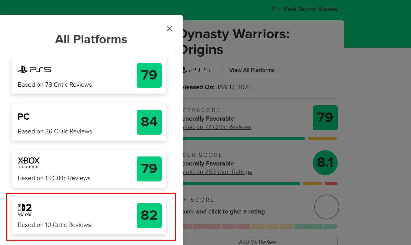 《真三国无双:起源》NS2版及DLC在MC上均获82分评价