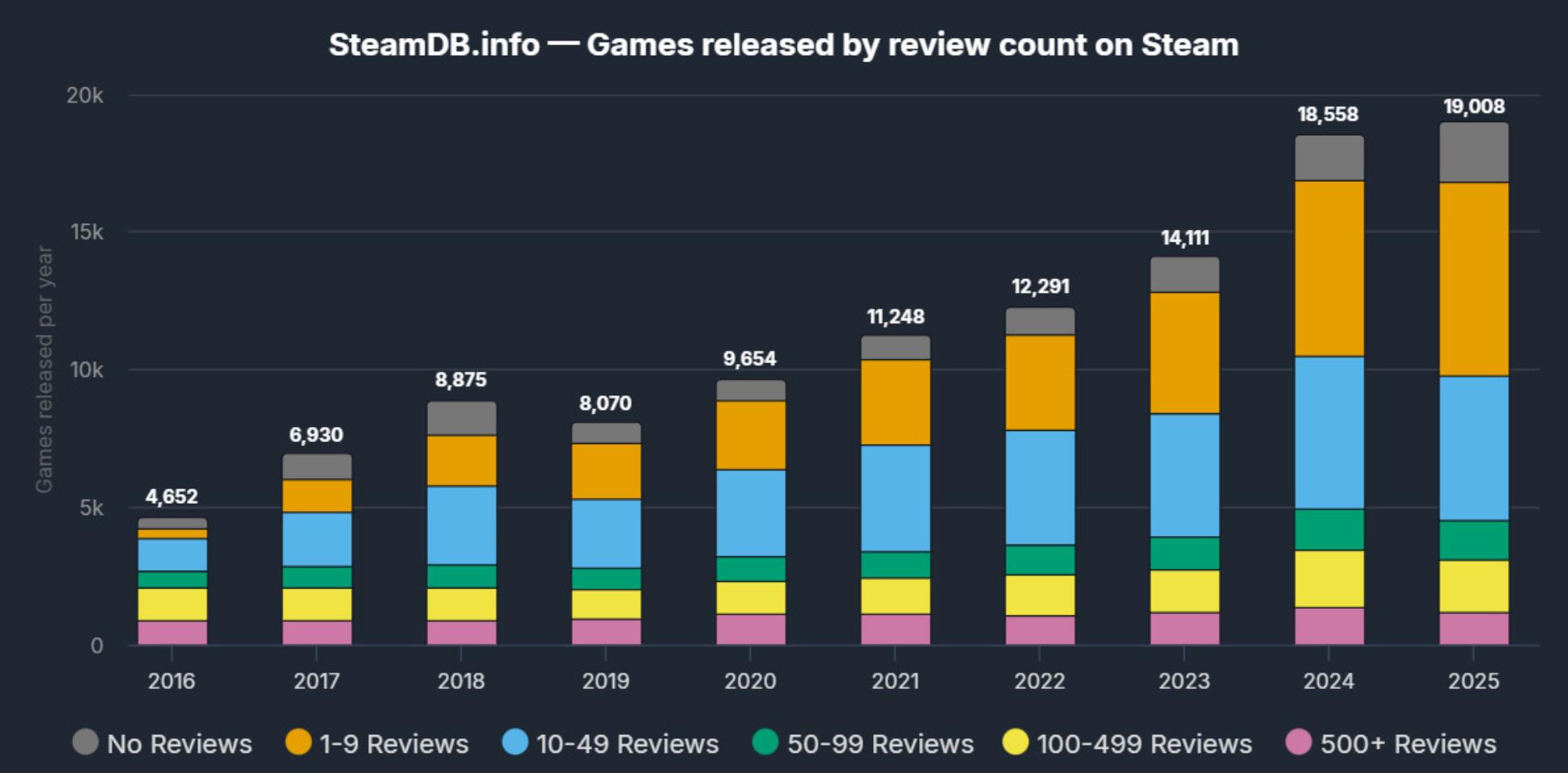 【玩家统计Steam平台今年首周上线230款新游,AI使用与内容泛滥引发关注】根据SteamDB提供的数据显示,近几年Steam上的新游数量连年增加。2025年再创新高,全年上线游戏数量超过1.9万款。但值得注意的是,这其中近一半作品的评论数不足10条。