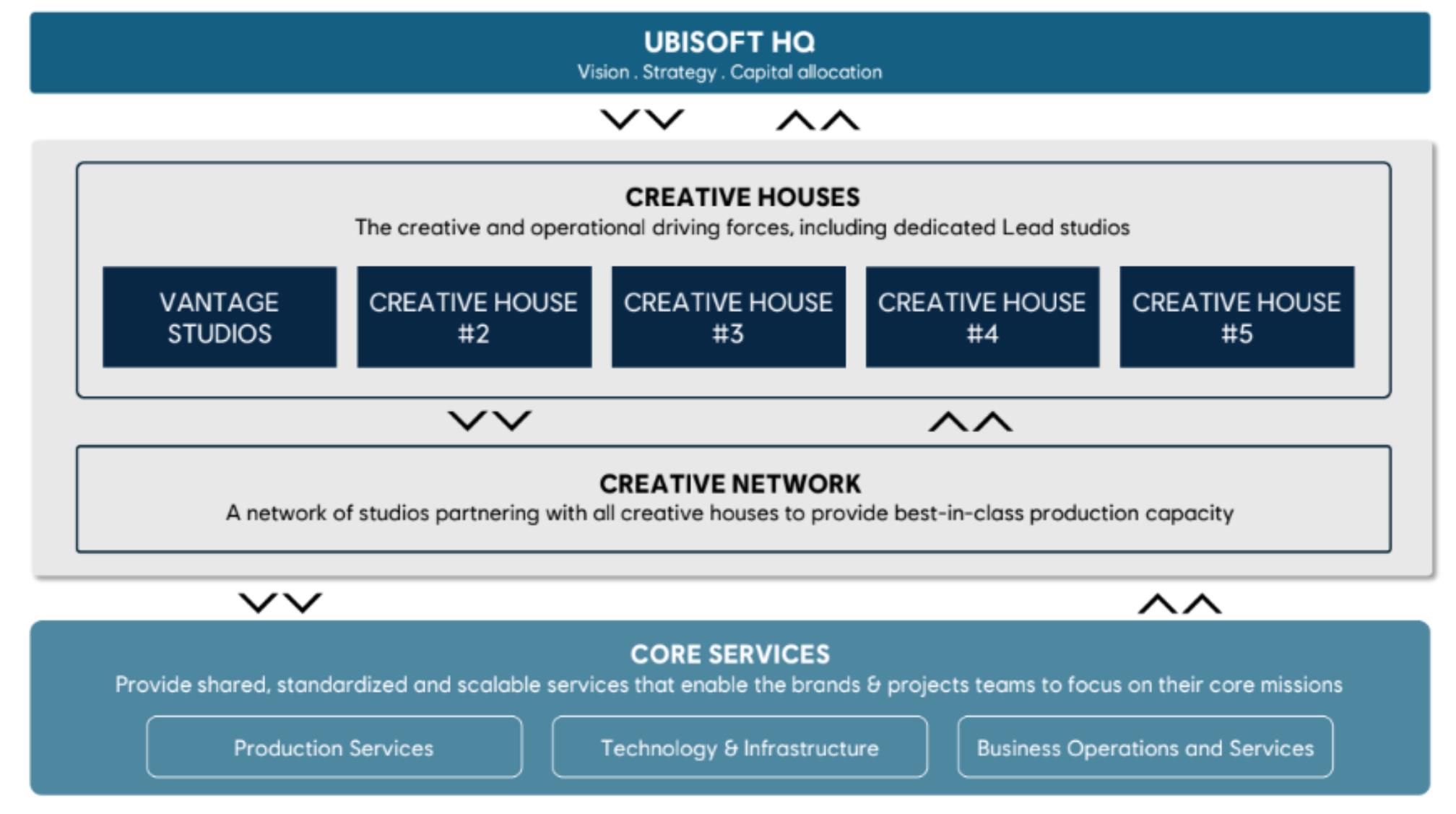 在公司结构上,育碧将转为去中心化运营模式,其工作室未来将整合为五大创意事业部(Creative Houses)。每个部门专注于不同类型与品牌,并拥有完整的财务责任: